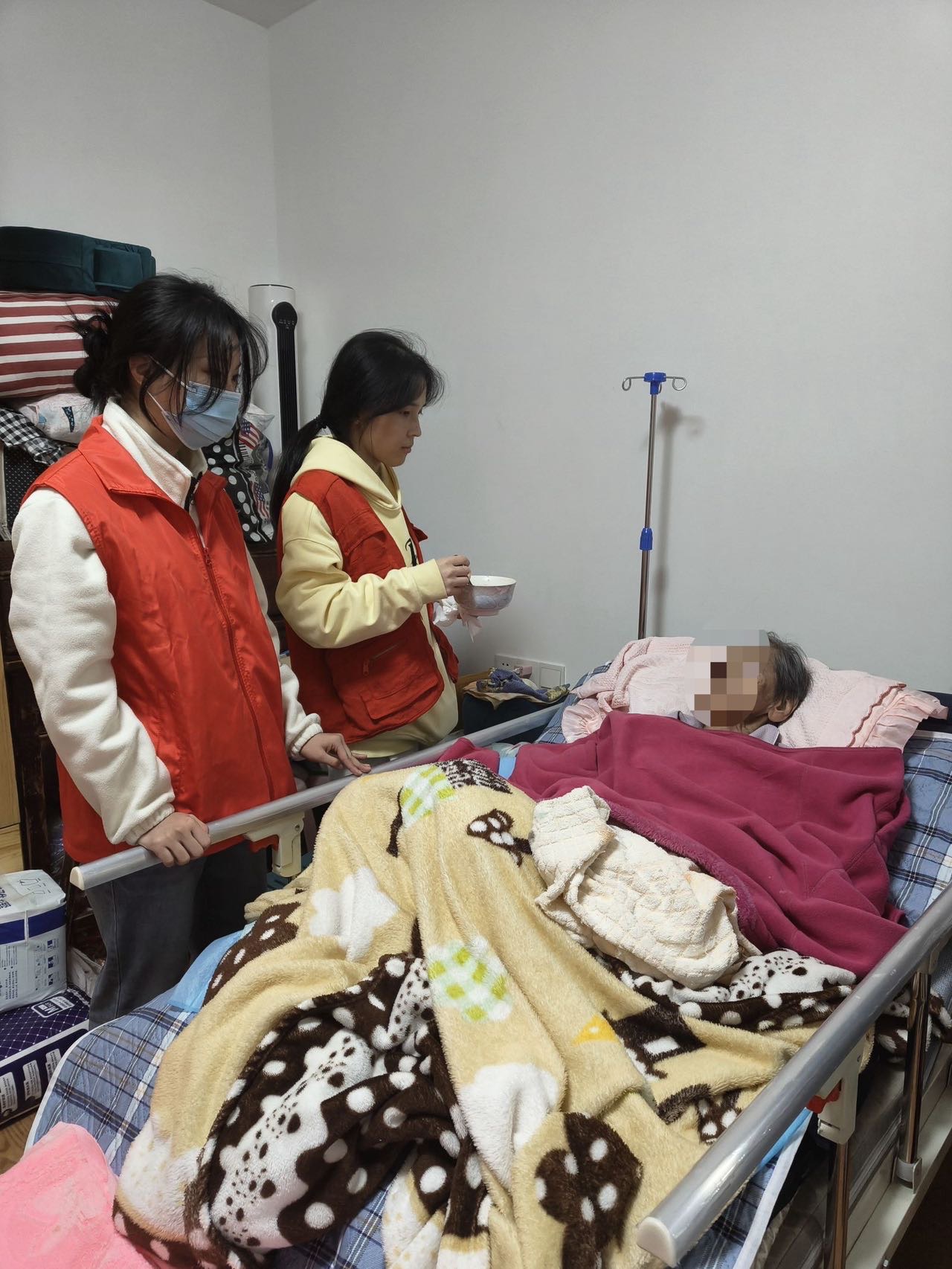 宁养义工们协助居家患者进食(作者,拿着餐具)
