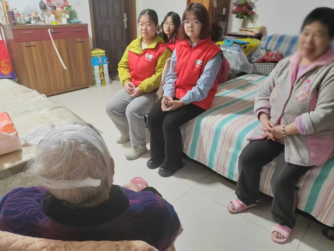 之后我们也向阿姨了解了一下奶奶最近的情况。阿姨讲道,奶奶现在只能吃流食,每天的排便需要药物助力,睡觉也会被疼醒。奶奶的行动能力基本丧失,她也很久没有出过门了。听到这里我的心微微抽痛,她家楼下就有热闹的集市,集市上有美味的小食,集市中充满了欢声笑语,可是奶奶却不能亲身去体验,奶奶家到楼下的距离好像变得遥远了。学中医的同学告诉阿姨:“奶奶还能吃得下,在中医中表明有胃气,‘有胃气则生’挺好的。”我们安慰着阿姨也真心希望大家的爱能让奶奶的病痛有所缓解。