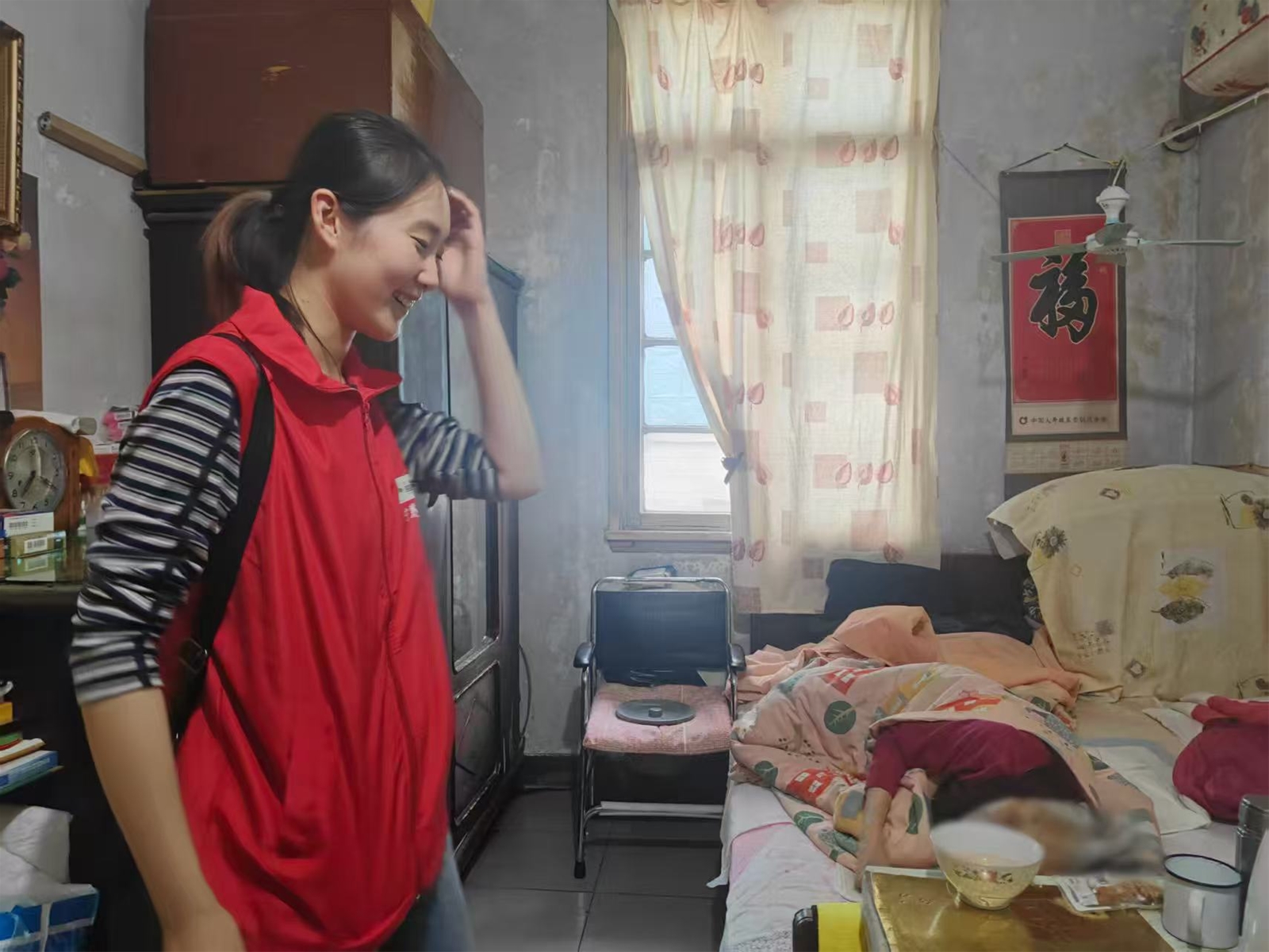 靳奶奶见到我们很开心,一直说“好孩子、都是好孩子”,我们四个搬好凳子围坐在床边,刚坐下,奶奶就催着我们吃橘子,等我们剥完橘子,又往手里塞上香蕉,这份直达心底的亲近感,让我起初的拘谨渐渐消失。