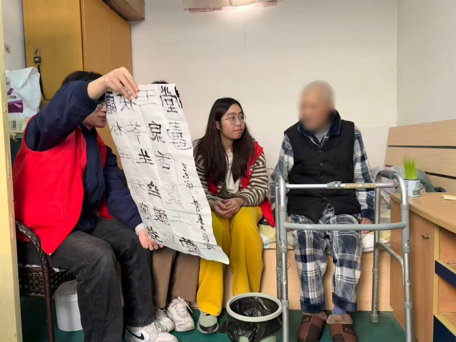 陈爷爷果然厉害,读起来,没有磕磕绊绊。我们不认识的字,他都认识,我们心里暗暗佩服。落款,陈爷爷也读了出来“己巳宁养义工敬赠”。陈爷爷细细端详“水平蛮高!”,说着要找胶水贴在墙上,见我们都没带胶水,陈爷爷说让女婿来贴。我们向陈爷爷保证,下周让写字的同学亲自来给陈爷爷讲解。陈爷爷说:“我喜欢书法。”嗯,我以为,会让陈爷爷开口去回忆他的哥哥。不过陈爷爷没有。嗯,陈爷爷喜欢就好,我们来陪伴陈爷爷,虽说让陈爷爷回忆起自己的经历,身边的人,当然是深入交流的一个标志,但是我们不能像记者一样去挖掘——我们是来陪伴的,只要陈爷爷开心就好!