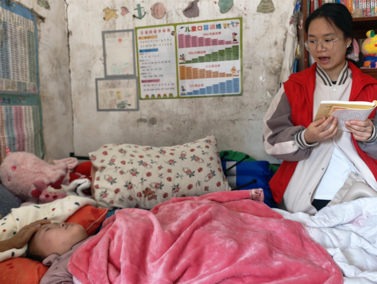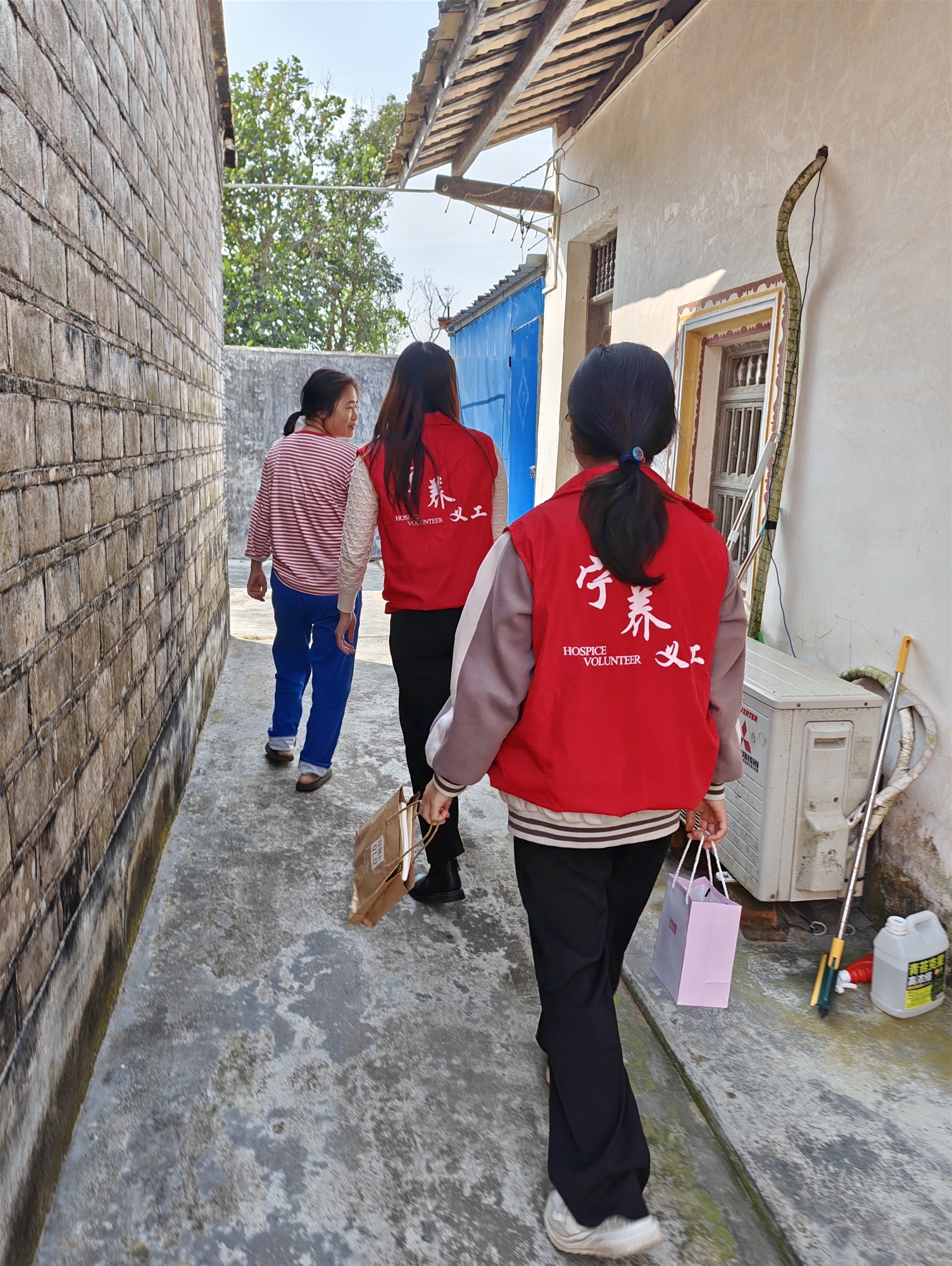 到了小朋友家,这是一个很有当地特色的院子,四周被院墙围起,院子中央为堂屋,四周是厢房。小朋友在的房间在院子最深处的一个厢房。走到房间门口,看到小朋友的第一眼,我有点惊讶,原来她已经这么难受了——几乎不能动,只能平平地躺着。小朋友躺在床的中央,反复喊着头晕、头疼,她的妈妈就为她轻轻地按摩着额头。小朋友看着社工阿姨送的水晶球,目不转睛,眼里满是小孩子童真。此时,我的心里难受:明明是才写了开头的人生,为何命运却要她就此停笔?得知小朋友还没有吃早饭,社工老师去厨房给她煮了鸡蛋面条。喂小朋友吃的时候,小朋友举起她仅还有力气的左手,竖起大拇指,称赞好吃。喂她吃另一个义工带来的酸奶时,她也抬起手示意,表示感谢。尽管小朋友深受病痛折磨,但她依然尽可能地照顾着每个人的感受和情绪,礼貌而体贴。小朋友左手手腕上有一条珍珠手链,“这是老妈给我买的。”她对妈妈有着一股深深的依恋,每当妈妈离开房间一会儿,她就会开始呼唤:“老妈!老妈!”然后妈妈就会赶过来,为她按摩额头。期间小朋友的爸爸听闻我们来探望了,从地里匆匆地赶回来。问候过后,又匆匆赶到地里去种瓜种菜。一家人都是如此地勤劳而质朴。