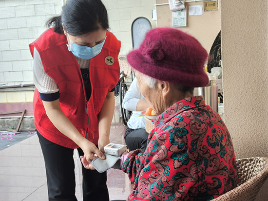 探访中,笔者(左,持有护士资格证)为患者测量血压