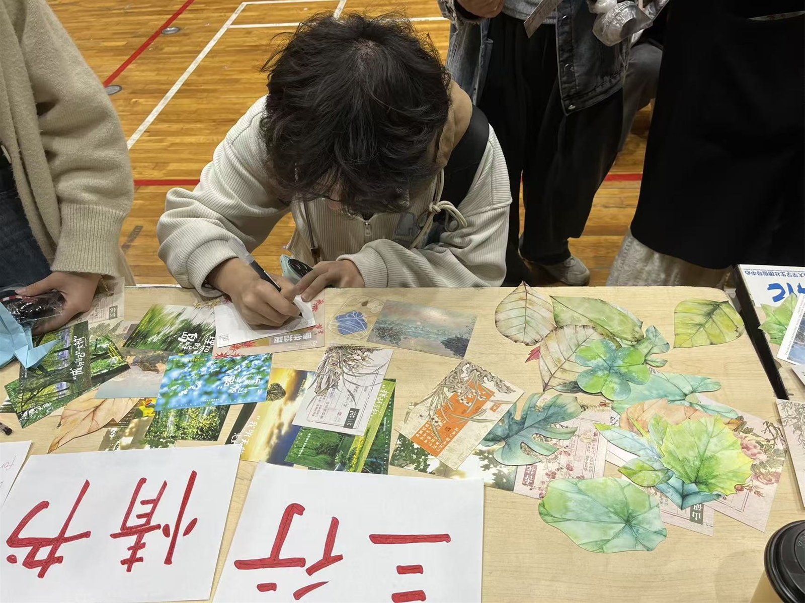 当同学们伏案仔细为患者们写明信片时,我不禁感叹生命,一定是有温度的。有位女生写了整整十分钟,写完腼腆地把明信片拿给我看,问:“这样写,可以吗?”眼神那么认真,她的每个字都承载着独特的重量。还有位男生拿着明信片在摊位旁徘徊着思考了很久,最后在明信片上留下:“窗外的梧桐叶快落光了,阳光却正好,暖融融地照进来。我们与您同在。”