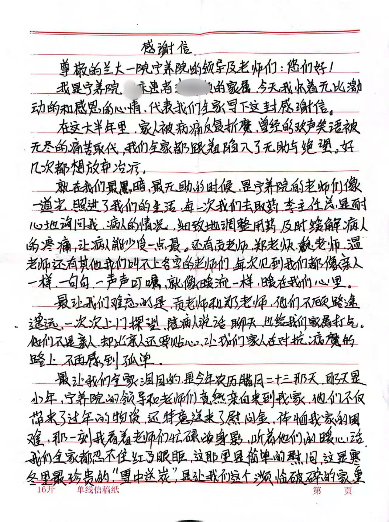 我是宁养院患者李顺(化名)的家属,今天我怀着无比激动的和感恩的心情,代表我们全家写下这封感谢信。
