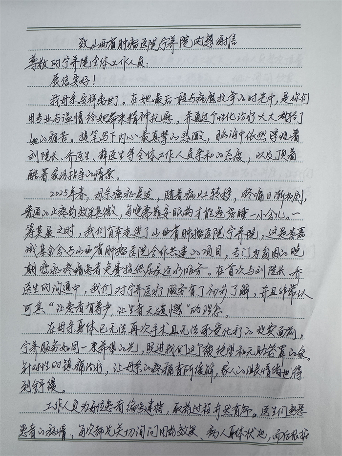 “妈妈的疼痛减轻了,清晨拉开窗帘,阳光洒在她脸上,又能看到今天的太阳。”这份在晨光里被守护的温暖,让癌症晚期患者的二女儿将亲手绘制的日出画作,连同满含真情的感谢信,一同送到了宁养院医护人员手中,用最有温度的方式,诉说着这段特殊的医患情缘。