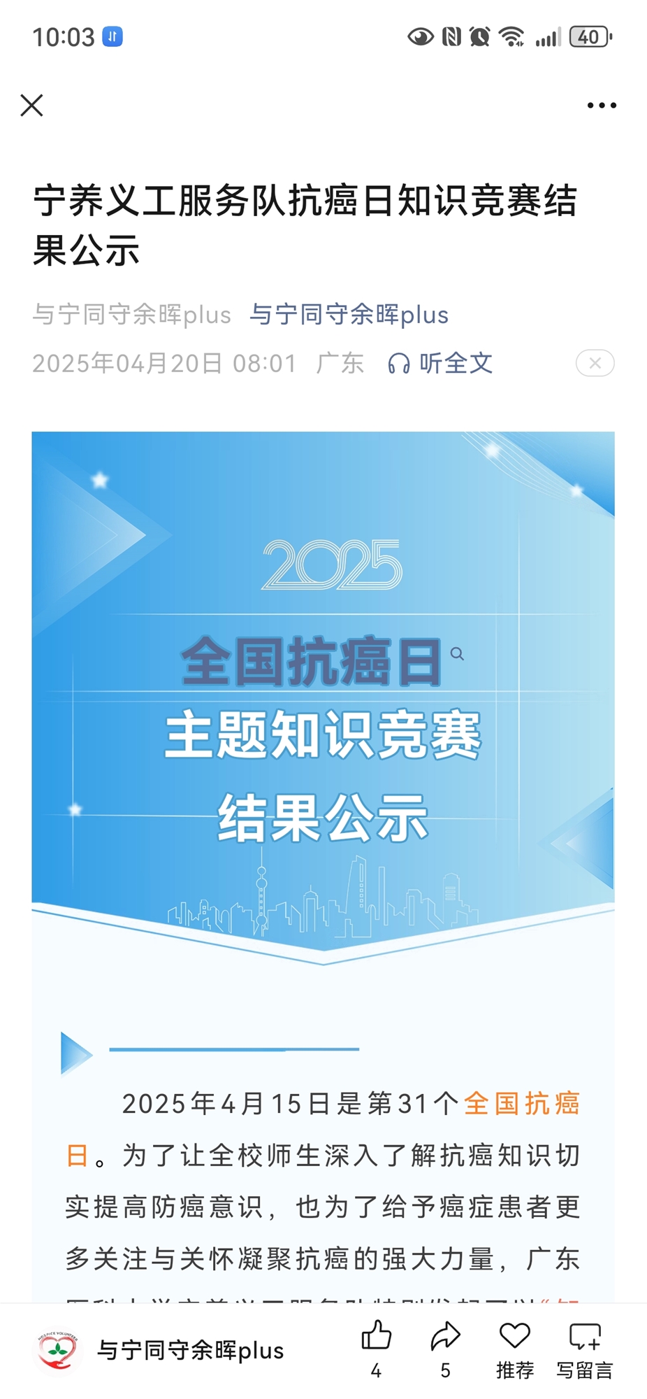 人间四月正芳菲,健康守护正当时,在第31个"全国肿瘤防治宣传周"到来之际,广东医科大学附属医院宁养院携手宁养义工服务队,在2025年3月至4月期间,举办线上知识竞赛活动、义诊及社区宣教活动,以进一步扩大癌症防控科普宣传,普及抗癌健康知识,宣传宁养服务,引导市民建立健康和科学的生活方式。