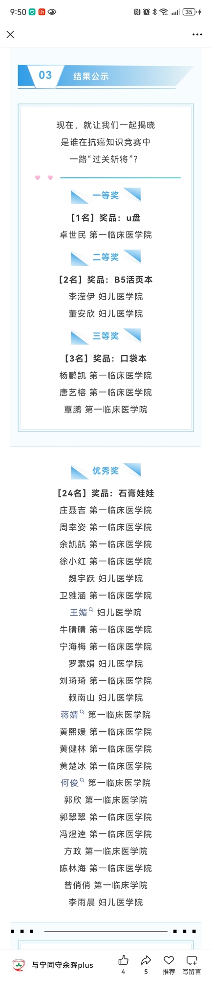 活动通过公众号推送及大家积极转发,同学们通过点击微信公众号链接,即可参与这场兼具知识性与趣味性的防癌知识竞答。为了推进“以赛促学,以学促知”的良性循环,本次比赛精心设置了30道核心题目,内容涵盖了癌症的成因、预防方法、早期症状、临床表现以及宁养服务的内容与意义等知识。此外,活动还特别准备了U盘、活页本等奖品,按照分数高低奖励给排名前30名的同学。