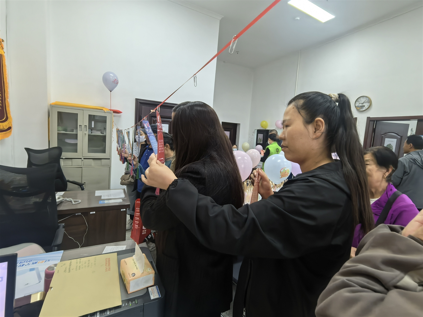 第二个活动区域是“猜谜语”,这里用趣味对话搭建起一处化解孤单的“情绪疗愈角”,让照护带来的沉重悄然消散。二十条彩色谜语卡片悬挂在绳上,像一个个藏着惊喜的小灯笼,瞬间勾起大家参与热情。现场的讨论声成了最温暖的底色。没人再独自沉默,三五成群围在一起,你一言我一语地热烈交流。“海上一只鸟,跟着船儿跑,冲浪抓鱼,不怕大风暴’,这肯定是海鸥!”一位阿姨笃定的声音刚落,旁边几位家属立刻点头附和,脸上露出“原来如此”的豁然笑容,彼此的默契在瞬间升温。遇到较难的谜语时,总有热心的家属主动递上思路:“你看提示里说‘与月亮有关’,再结合中秋习俗,是不是‘月饼’呀?”讨论中对谜题的好奇、对答案的期待,以及与他人交流的轻松;有家属看到其他家属猜对时,主动鼓掌喝彩,家属间的距离在欢声笑语中被彻底拉近。有家属猜对谜底,宁养院工作人员便递上一根棒棒糖作为奖励。家属们剥开糖纸时,甜意顺着味蕾蔓延,脸上的笑容也愈发灿烂。