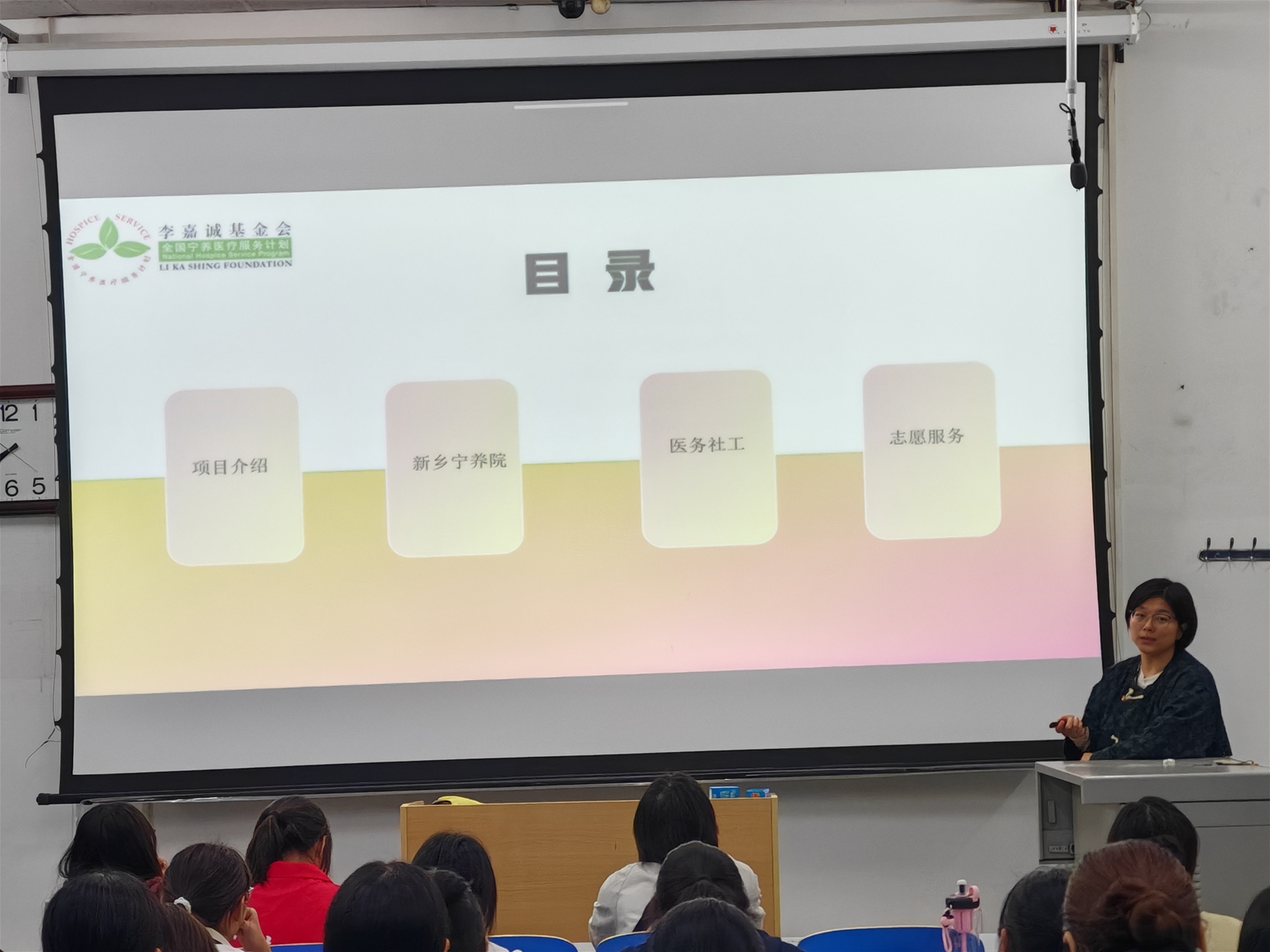 培训伊始,新乡宁养院社工张丽卉老师从宁养院的成立开始,详细梳理了宁养事业的发展历程,让义工们深入了解宁养服务的起源与初心。随后,张老师聚焦新乡宁养院的实际运营情况,全面介绍了该院的服务内容,同时结合具体数据和案例,展示了当前的服务覆盖范围、服务对象需求特点及服务成效,让义工们对宁养服务的实际场景有了直观且清晰的认知。