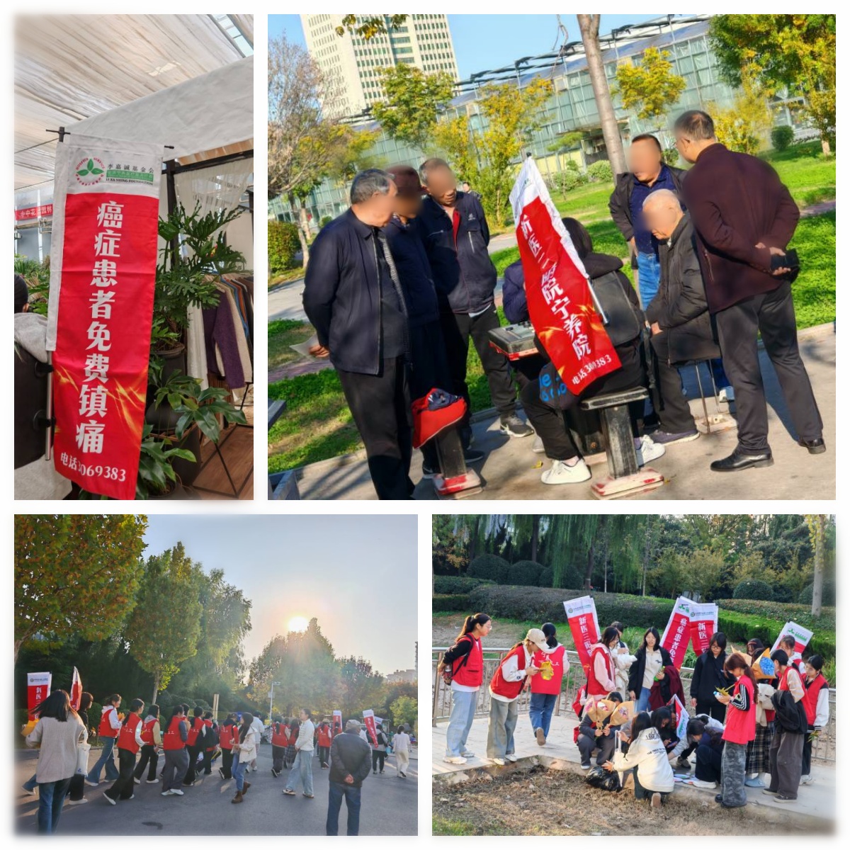 活动当天,身着统一服装的宁养义工们肩背印有 “河南医药大学第三附属医院” 及 “癌症患者免费镇痛” 字样的宣传背旗,精神饱满地从医院出发,向着目的地行进。徒步途中,义工们化身 “健康宣传员”,积极向沿途居民、商户发放精心制作的宣传册。宣传册内容丰富详实,不仅详细介绍了宁养院的服务宗旨、服务内容,为有需要的癌症患者及家庭提供指引,还重点展示了医院肿瘤中心的诊疗优势和康复科的特色服务等,让公众全方位了解医院在肿瘤治疗与康复领域的专业实力,进一步扩大医院的社会影响力。
