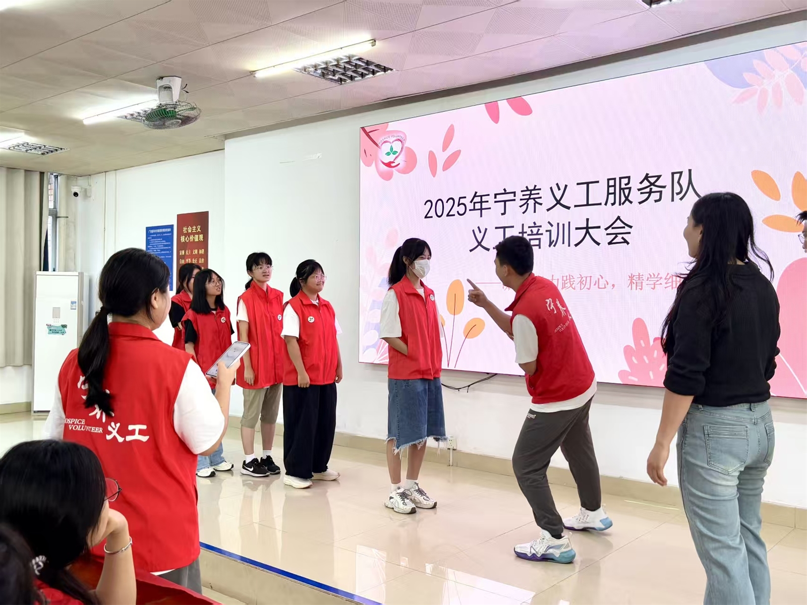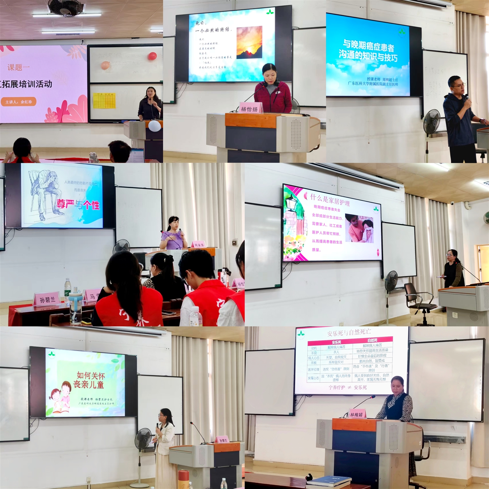 2025年11月16日,广东医科大学附属医院宁养院宁养义工服务队,在广东医科大学新教学楼开展了主题为“凝心聚力践初心,精学细训助宁养”的义工培训大会。本次培训大会邀请了宁养院老师们来为义工们进行授课,大会分为义工拓展培训和理论知识学习两部分来进行,旨在宣传宁养临终关怀服务理念,弘扬宁养精神,让义工们更好更全面地了解宁养。