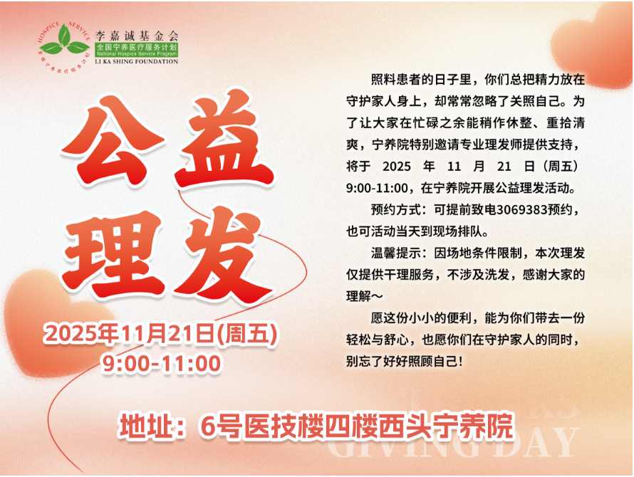 2025年11月21日,河南医药大学第三附属医院宁养院暖意融融,一场以关爱晚期癌症患者家属为主题的公益理发活动在此顺利开展。活动旨在为长期奔波忙碌的患者家属提供贴心便利,让他们在守护家人的间隙,也能收获一份清爽与舒心。