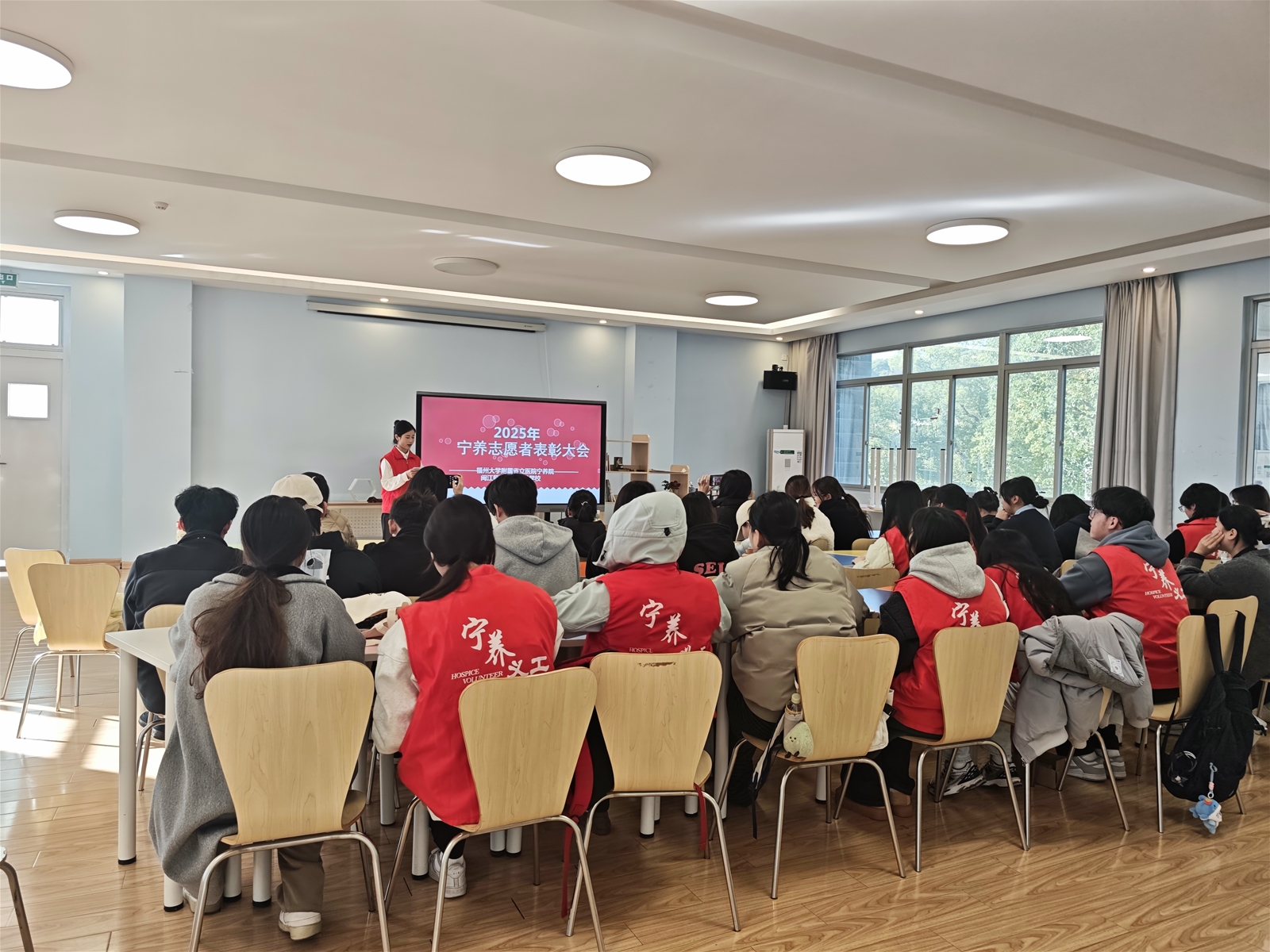 为弘扬奉献友爱的志愿精神,总结2025年度宁养志愿服务工作成果,表彰优秀的宁养志愿者 (宁养义工) 及团队,激发全体志愿者的服务热情,增强集体凝聚力,提高宁养服务质量,更好为宁养患者和家属服务,2026年1月14日,福州大学附属省立医院宁养院医务人员、志愿者、校方代表在闽江师范高等专科学校齐聚一堂,举办2025年度宁养志愿者表彰大会。现场有44位志愿者齐聚一堂,共同回顾过往一年的服务足迹,见证奉献之光,展望未来之路。