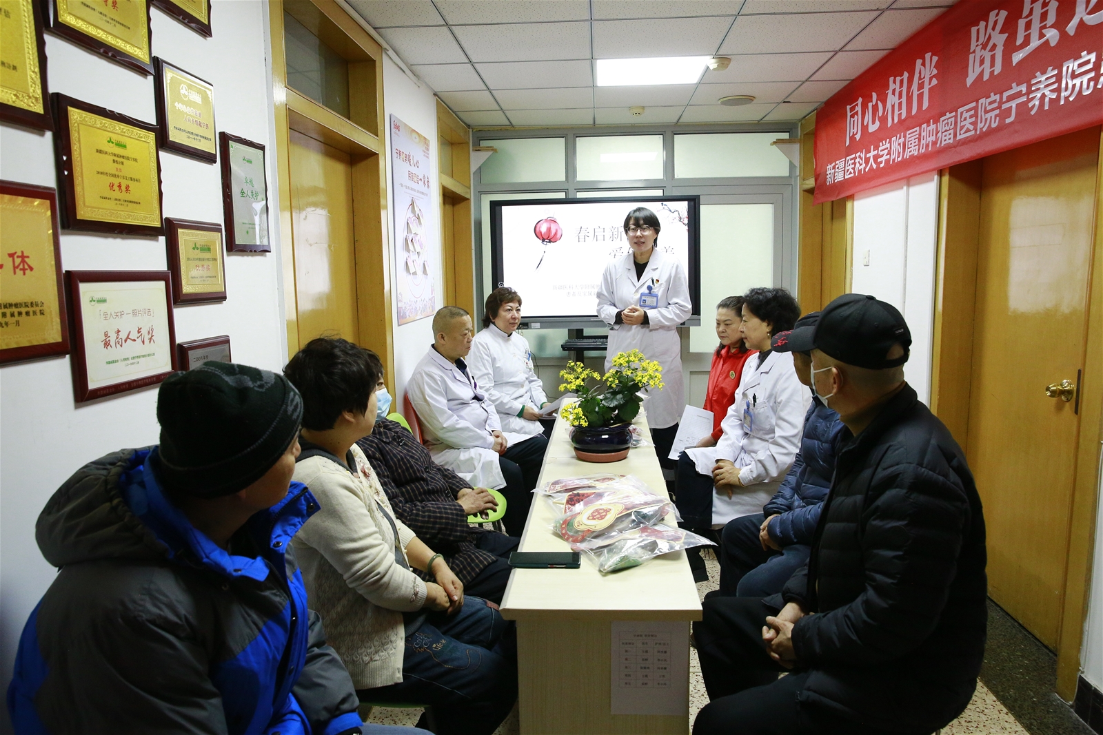 2026年2月11日,新疆医科大学附属肿瘤医院宁养院暖黄色的灯光裹着淡淡的艾草香,“春启新程,爱伴宁养——患者及家属新春暖心会”在一片欢声笑语中落下帷幕。患者及家属与宁养医护社团队近20位围坐一堂,在暖香氤氲的上午,用交流消解焦虑,用手作传递温度,在新春的暖意里,共赴一场充满爱与希望的相聚。