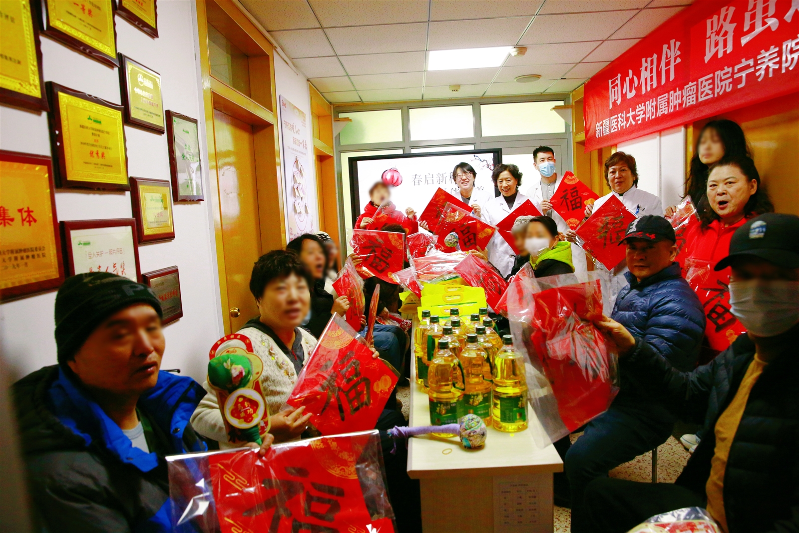活动最后,大家不仅互相传递着祝福的话语,更收获了沉甸甸的温暖。社工提前一周就联络了长期合作的爱心人士,为现场的患者及家属准备了新春慰问礼包——每一份都装着大米、食用油等生活品,搭配着红彤彤的春联和福字,既喜庆又实用。
