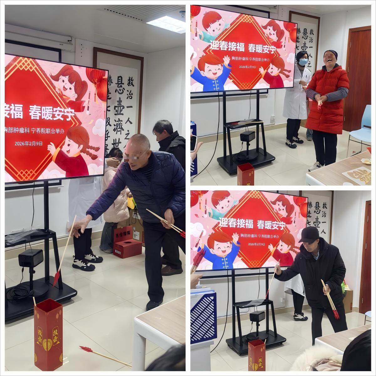 随后的“一掷千金 好运连连”趣味竞赛更是将现场气氛推向了高潮。不少患者以及家属的来到投壶区跃跃欲试。大家手持箭矢,屏气凝神,瞄准壶口——“中了!”随着一支支箭矢在空中划出优美的弧线稳稳落入壶中,现场爆发出阵阵热烈的掌声与欢呼声。无论是精准命中的喜悦,还是遗憾擦边的惋惜,都化作了此刻最纯粹的欢笑,大家互相切磋技巧,病房里洋溢着浓浓的年味与温情。