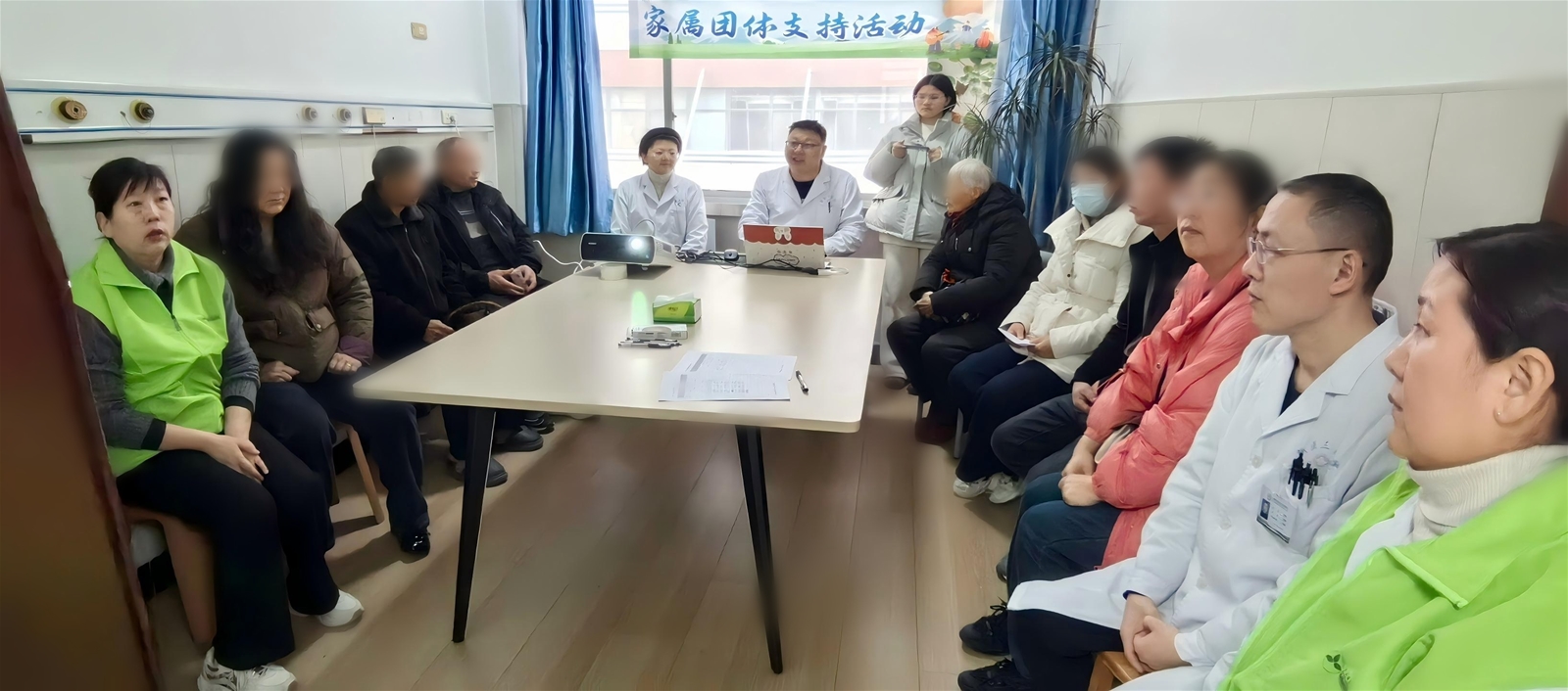 家属们聆听程刚老师 (左六) 分享中医技术在居家的照护知识