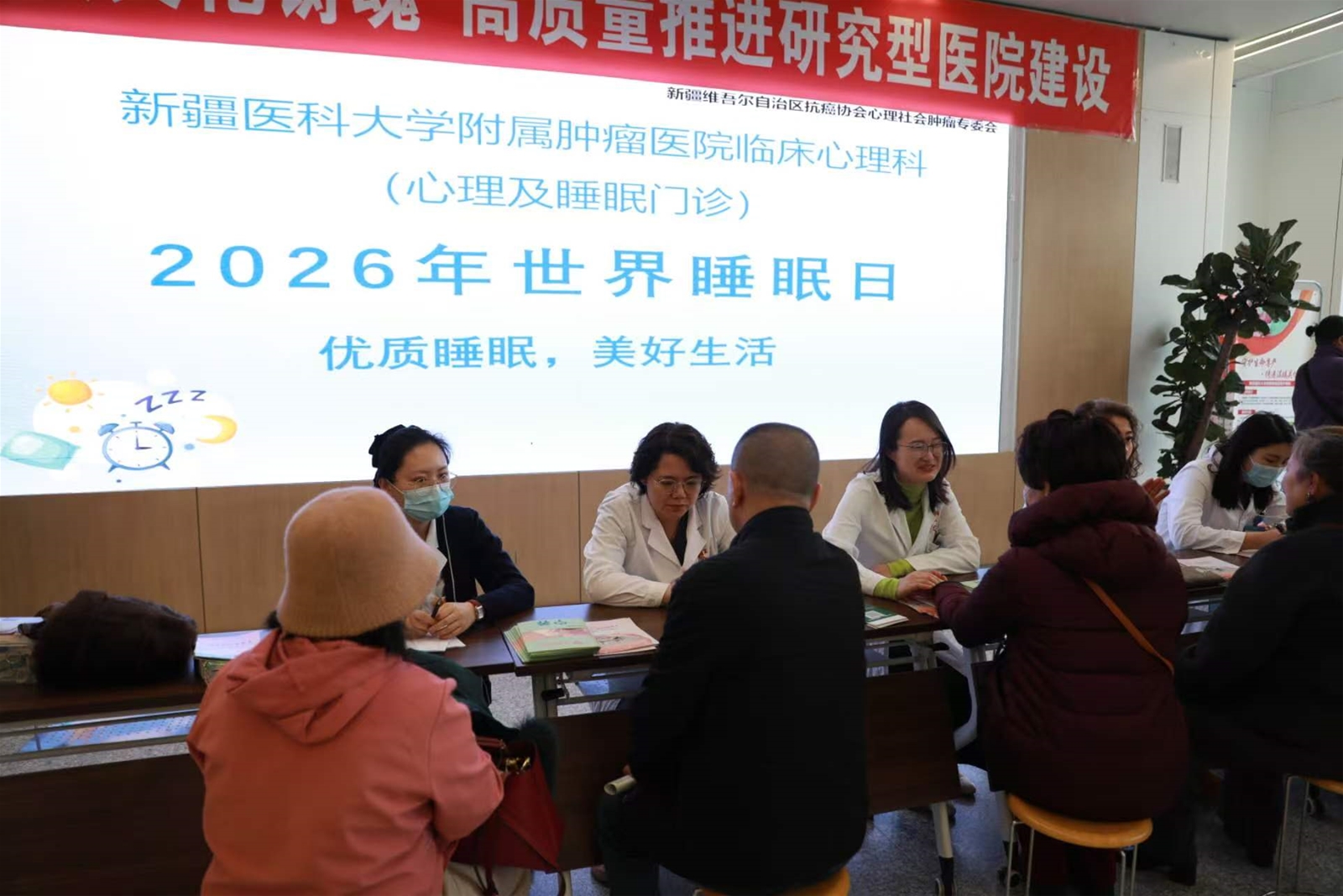 2026年3月18日,围绕“世界社工日”与“世界睡眠日”主题,新疆医科大学附属肿瘤医院临床心理科、宁养院联合中医肿瘤科,共同举办了“情暖三月,义诊同行”多学科公益义诊活动。本次活动将医疗服务与人文关怀深度融合,通过“一站式”健康服务平台,为百余名群众送去专业诊疗与暖心关怀。