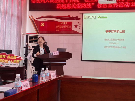 2026年3月17日是第20个世界社会工作日,今年主题为“以希望及和谐,永续幸福社会”,聚焦凝聚社会力量、守护生命尊严、共建和谐家园。为践行社工服务理念,普及安宁疗护知识,提升基层医务人员与辖区群众对癌症患者的关爱照护能力,破除癌症认知误区,3月18日下午,德宏州人民医院宁养院联合芒市遮放镇中心卫生院,开展“社工筑暖,宁养护航——2026年社工日走进遮放,共筑癌患关爱防线”主题宣传活动,让专业社工服务与温情宁养关怀直达基层。遮放镇政府领导、宁养院医务人员、卫生院班子成员、临床医护人员、各村卫生室医生、各村委会工作人员及患者家属代表共40余人参加活动。