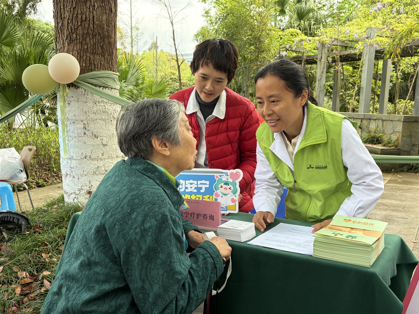游园体验区气氛更是热烈至极,养生咨询摊位提供血压测量和体质辨识;时令茶饮摊位让居民免费品尝菊花枸杞茶、玫瑰花茶等应季饮品;耳穴体验和香囊手作摊位由护理职业学院师生带领,帮助居民体验中医文化。安宁科普、快问快答、宁养服务咨询及“树洞小屋”一对一沟通等摊位,也吸引了大量居民驻足参与。