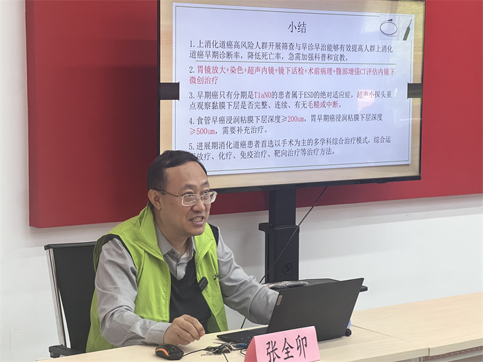随后,山西省肿瘤医院内镜中心张全卯主任带来消化道肿瘤专题科普。张主任用通俗易懂的语言,将专业晦涩的肿瘤症状、诊疗过程,生动比喻为“贴膏药”“补衣服”,化繁为简帮助居民理解医学知识;同时结合临床真实案例,重点倡导“早发现、早诊断、早治疗”的防癌理念,叮嘱居民重视定期体检,主动做好癌症筛查,筑牢健康防护第一道防线。