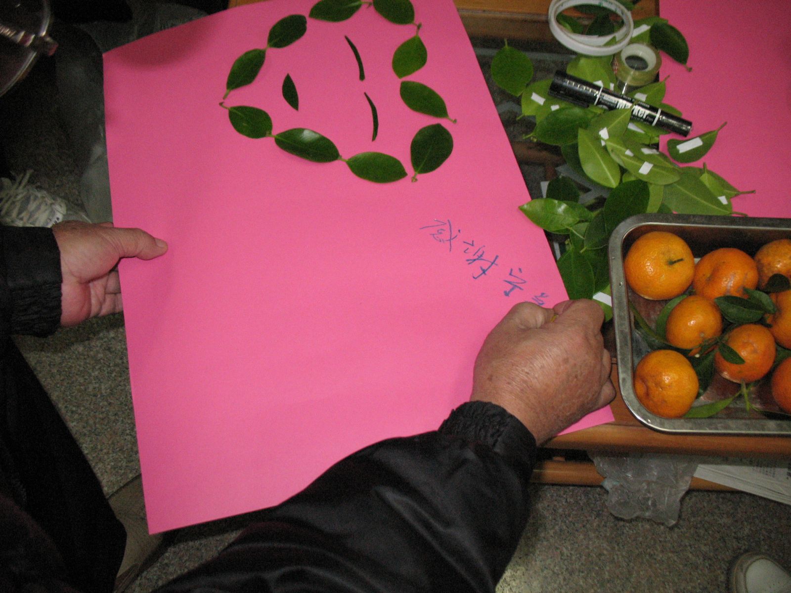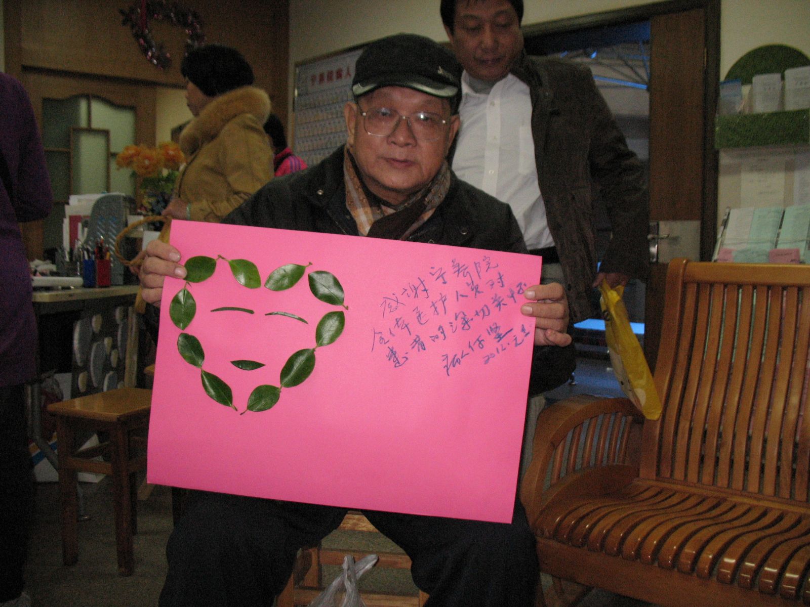本次活动有25人参与。活动开始,家属们对这次的活动有一点好奇,纷纷询问社工摆桌上的树叶子是拿来做什么用的。在社工和义工们的解说和鼓励下,家属们纷纷参与到了我们的“叶子多彩”活动中。家属们用新鲜的绿叶子在彩纸上贴出了各种图案,有些家属还写上了感谢寄语和题词,表达了他们对患病亲友的美好祝愿以及对宁养院的感谢之情。期间病人及家属们还就一些病情和照顾经验作了交流,积极讲述了自己的家属护理感受。活动达到了预期的效果,在一片热闹的气氛中圆满结束。