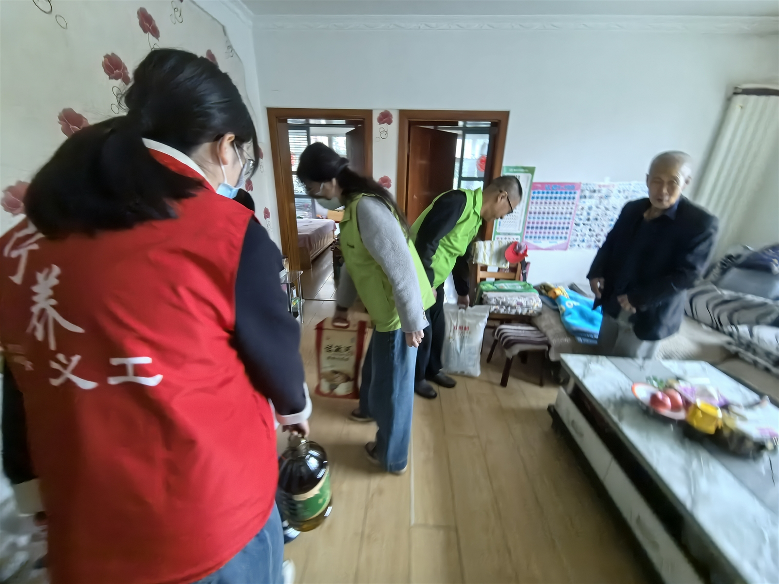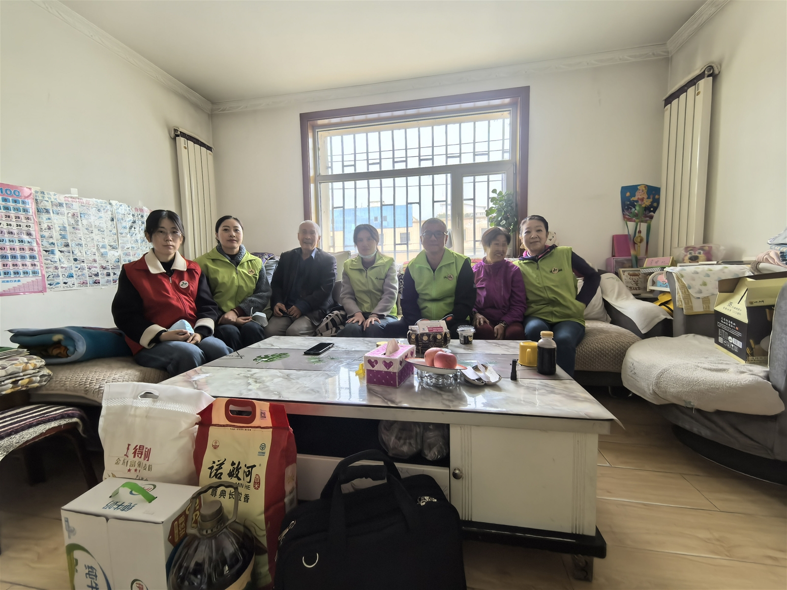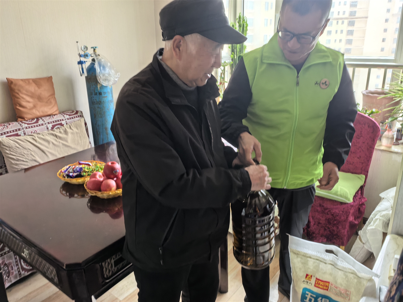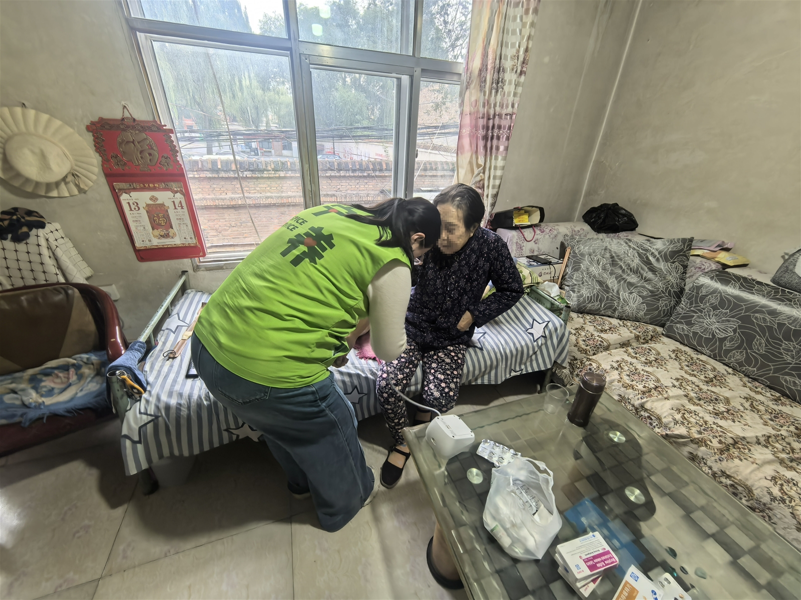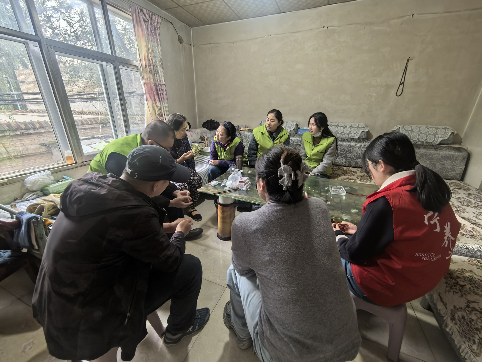 随后,团队驱车来到郊区宋女士的家中。76岁的宋女士罹患肺癌并全身转移,接受宁养服务已满一年。这个家庭的经济状况令人揪心——儿子和儿媳靠打零工维持生计,收入极不稳定。然而,亲情的温暖在这里熠熠生辉:自从母亲患病后,儿子毅然放下工作,全心全意守在母亲身边照料。