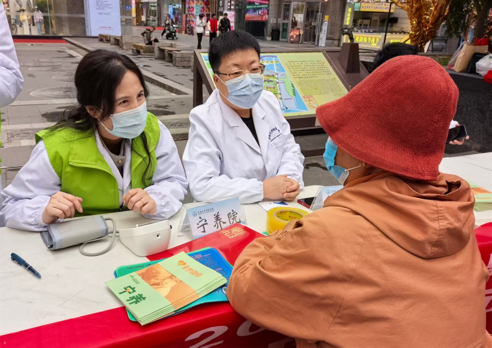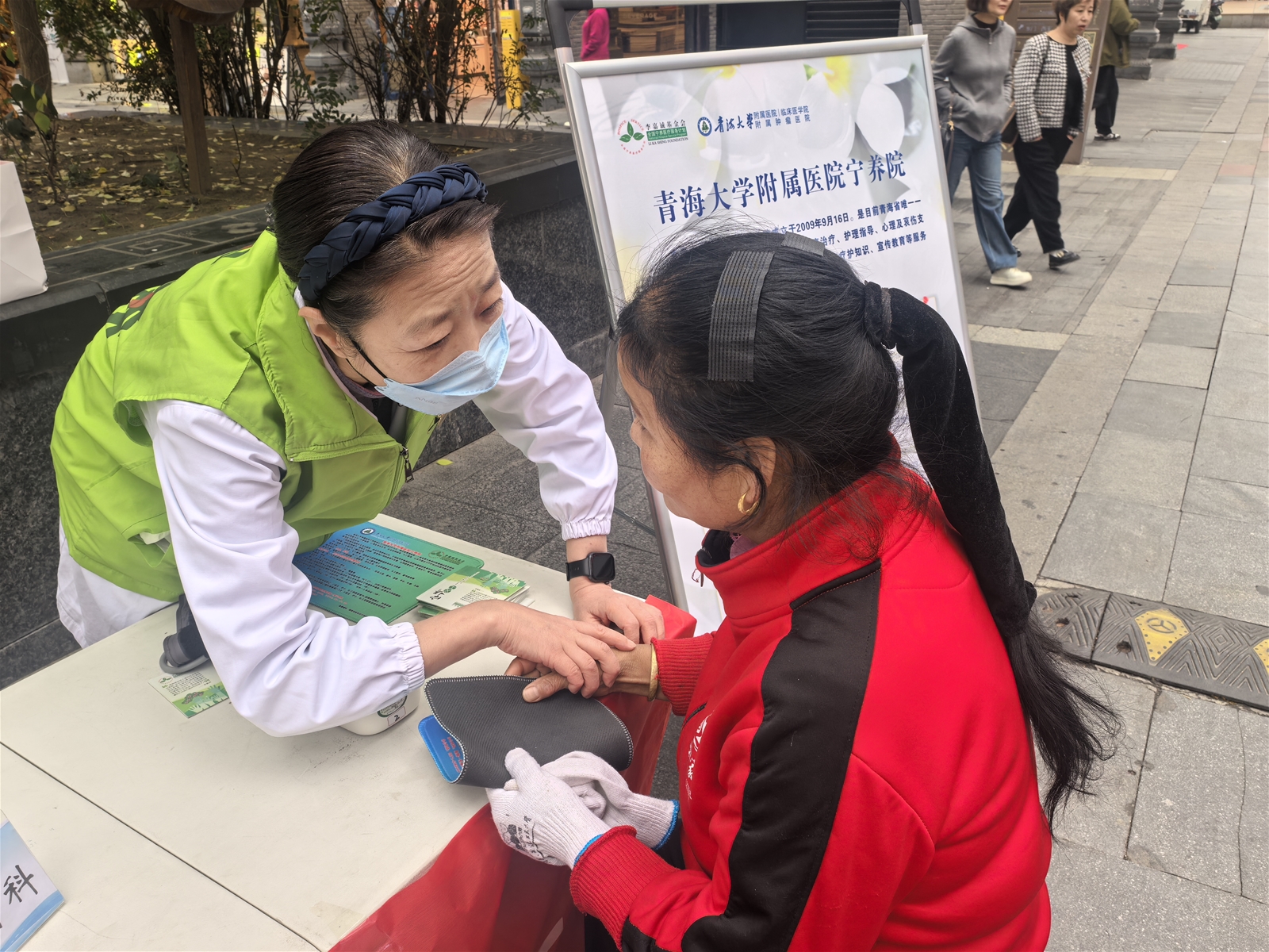 与义诊区遥相呼应的是宁养理念宣传区,这里被视为播种希望、传递温暖的“思想阵地”。在宁养院郭海州副主任的统筹下,沙莉、赵隆香、许玲玲等核心成员与五位充满爱心的义工一道,成为了宁养理念最积极的传播者。