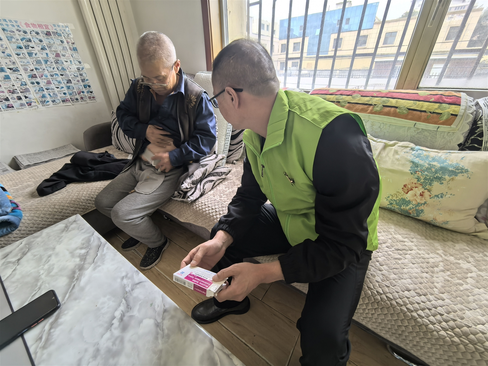 最后走访的是詹先生家。詹先生罹患膀胱癌,接受宁养服务已两年多。这个家庭面临着多重困境:除了詹先生的病情,其孙子还患有癫痫,病情时常反复发作。儿子和儿媳在外打工维持生计,妻子一人需要同时照顾生病的丈夫和孙子,家庭经济十分困难。