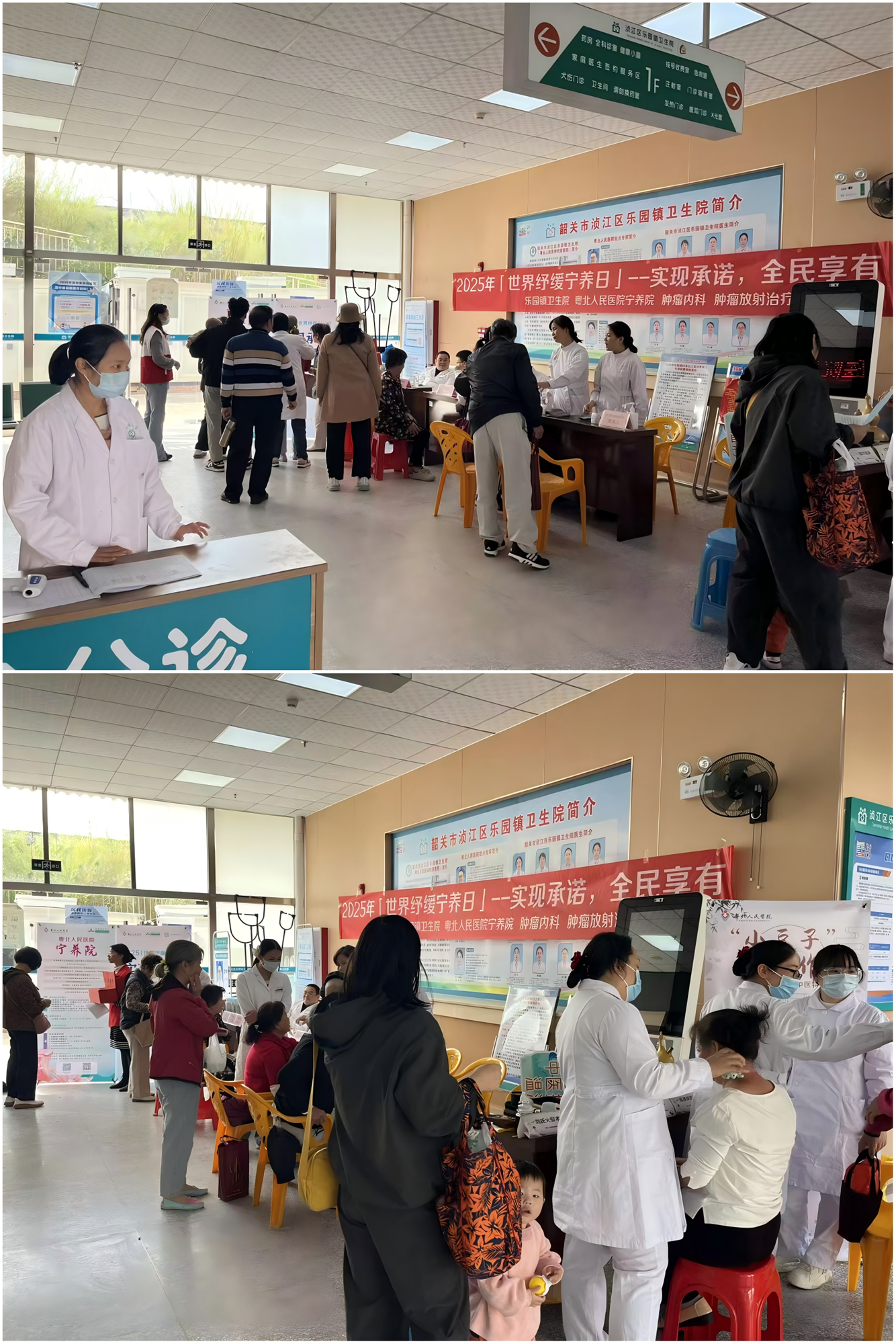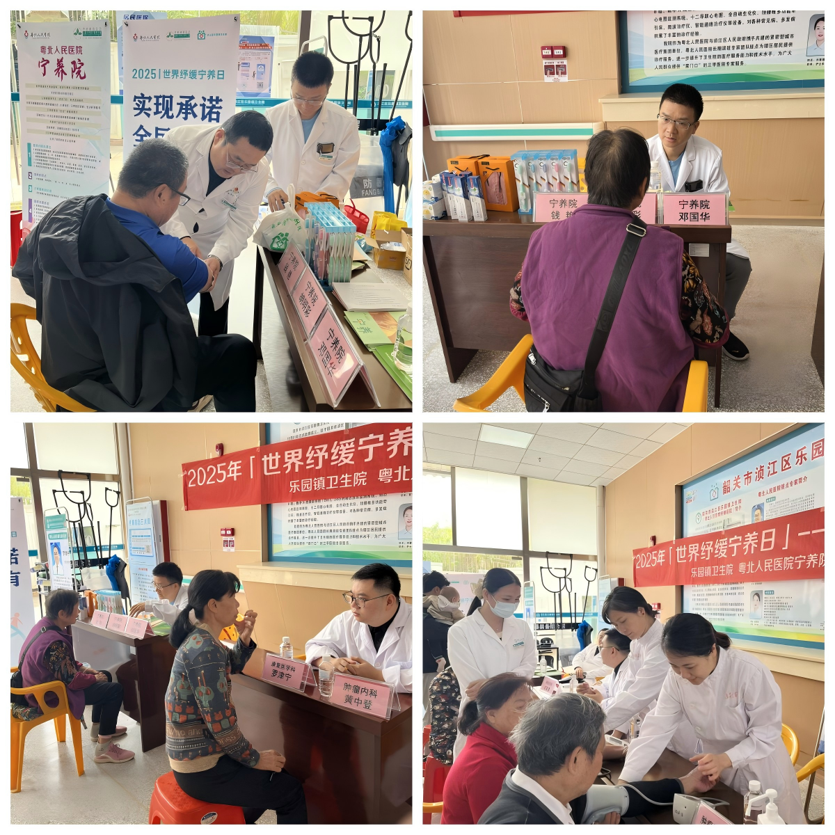 在世界纾缓宁养日(10月11日)与重阳节相继来临之际,为传承中华民族尊老敬老的传统美德,践行世界纾缓宁养日“实践承诺,全民共享”的主题,粤北人民医院宁养院携手肿瘤内科、肿瘤放射治疗科专家团队、浈江区乐园镇卫生院、社会爱心企业及义工团队,共14位成员,于2025年10月24日上午在乐园镇卫生院门诊大厅,共同举办了一场面向社区居民,尤其关注长者健康的义诊宣传活动,让“老有所安、病有所纾”的安宁疗护理念真正走进居民“家门口”。
