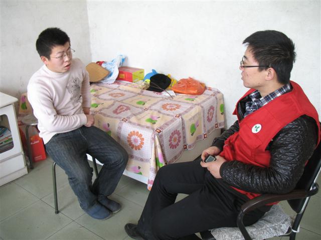 我们询问小康每天的生活情况,他说每天的任务就是2-4小时给父亲翻身、擦洗身体,做一日3餐,基本不出家门。我们很佩服小康这5年如一日,能耐住寂寞如此用心、细心地照顾父母,同时又担心小康长期的照顾病人不与同龄人交流会变的孤僻,心理有阴影。回来后我们把小康转介给了社工。社工辛老师与大学生志愿者杨效一起去了他的家。与同龄人在一起,小康变得十分的健谈,俩人时不时发出爽朗的笑声,整整交流了一个半小时,从大学生的就业现状、到对人生的看法、对待死亡的态度。小康对目前所处的处境感到无奈,同时也已经接受了。觉得自己能亲自侍奉父母床前尽孝,这也是上天对他的恩典。照顾父母这5年时间他觉得自己成熟了很多,对人生的追求有了重新的看法,人这一生可以追求功成名就、可以追求家财万贯,但都没有追求一生问心无愧来的真实与贴心。