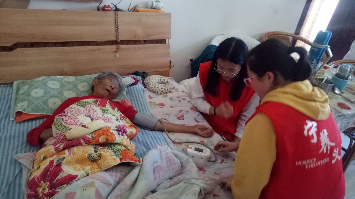 走在长长小路上,很远就看到了等待中的阿姨,她向我们挥手欢迎我们的到来,进门前告诉我们她母亲(患者)刚刚才睡着,示意我们说话做事轻一点,以免打扰到休息中的老人。跟随老师进屋,在卧室门口远远看见床上躺着一个老奶奶,第一眼给人的感觉是瘦小!直到近身给老奶奶量血压时,我才看清了老奶奶的样子:花白的头发有些凌乱,双眼紧闭,布满皱纹的脸上干巴巴的,没有肉,骨骼明显,当我伸手轻轻握住老奶奶的胳膊时,不禁一怔:真是太瘦了,简直用皮包骨头形容也不为过,因为触摸感是那样的真实!人是如此的脆弱,面对病魔,我们也会束手无策,只能默默承受!