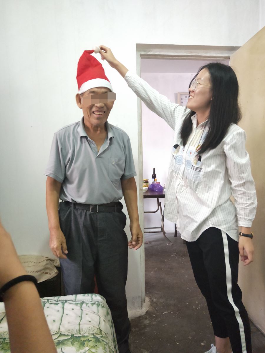 另外爷爷也特别可爱。在谈话中无意中提到了圣诞节,爷爷突然起身,当我们一脸茫然的时候,爷爷突然从衣架上拿出了圣诞帽子。我就帮爷爷带到头上,然后和爷爷一起合了影。拍完后爷爷还说让我看看我上不上镜,爷爷真的好可爱啊!我想,这样的话也许只有经历过无数人生阅历的人才可以说的出吧!我们和爷爷有好多说不完的话,好像我们是好久不见的朋友,很亲切,让彼此感到很温暖。爷爷笑着对我们说:“好喜欢你们这群年轻人。”有了爷爷的这句话,我就暗下决心,只要我有时间我一定多去陪陪爷爷,让爷爷可以感受到宁养以及我们给予他的爱,在说话的互动中感受到我们的温暖。