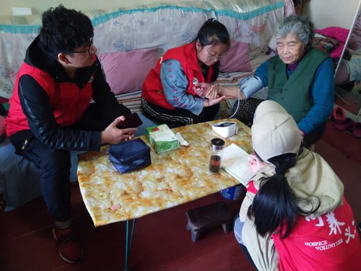宁养义工作者为老奶奶量血压