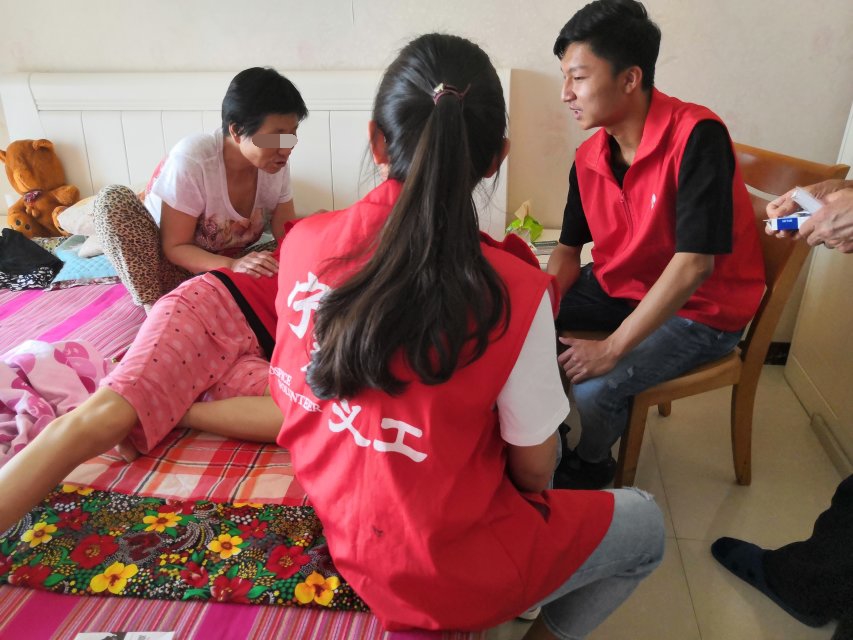 好在我们上午的接案并没有出现状况,并且大家接到的案主情况都较好,我们都稍稍松了一口气。我的案主是最后一家也是最远的一家,有了之前几家案主的经验,我已经提前做好了心理准备。但当我第一次看到案主时,还是被案主的情况吓了一跳。虽然阿姨年纪不大,但却因为疾病的原因一直卧床不起,偶尔还会因为难受流泪不止,家属看到阿姨如此难受也是泣不成声,一时间我们全部人的心情都低落了下来。幸好,宁养院社工辛老师及时安抚住了案主及家属的情绪,并且提供了切实的解决方案。