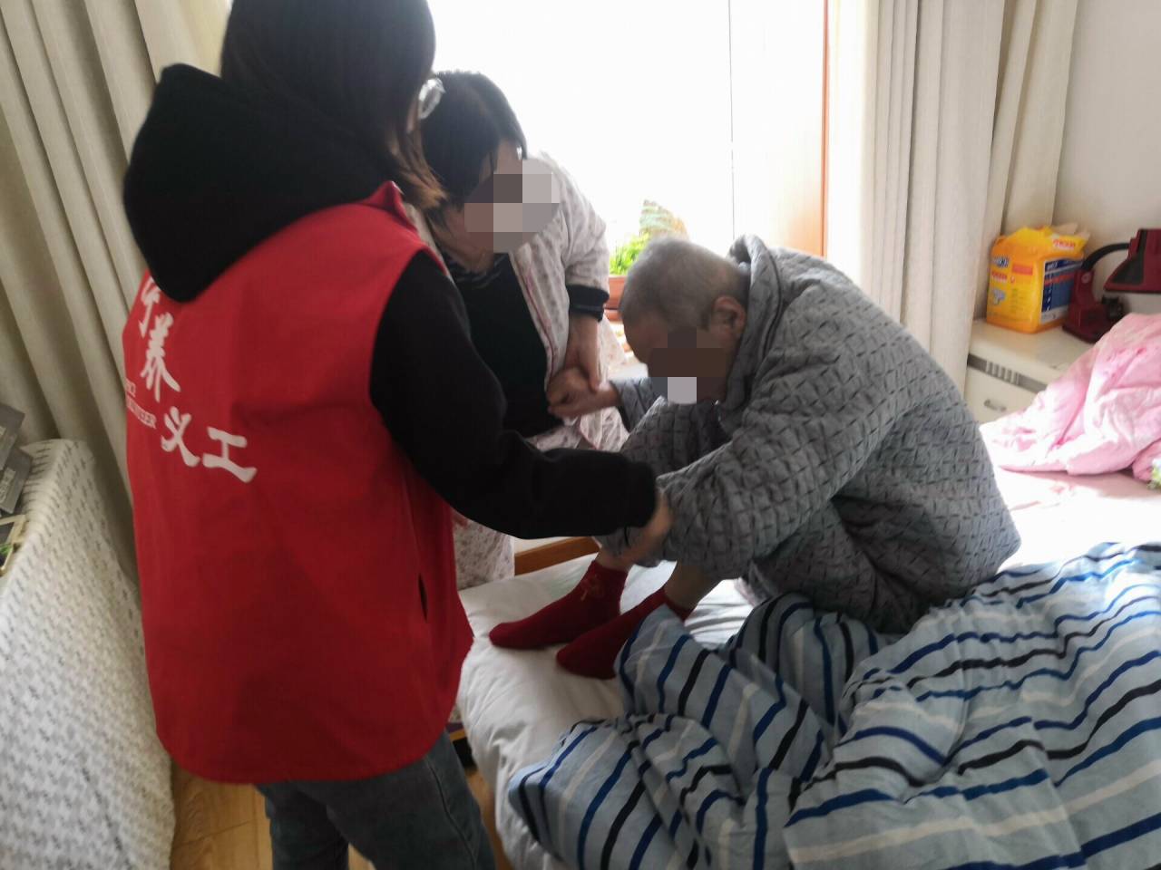 再次家访时,我们开始和奶奶聊天,十分亲切,在家中,我们看到奶奶照顾卧床的爷爷,为缓解爷爷的无聊苦闷给爷爷播放音乐,为爷爷悉心煮粥,因为加了香蕉爷爷吃得少而又重新去做,看到奶奶为爷爷身体担心,因为之前水肿焦急寻求大夫的帮助,面对爷爷好好吃药,好好配合,奶奶都会拍着爷爷的肩膀鼓励他,说他很棒......这些我们都看在眼里,被奶奶和爷爷的感情所感染,互相厮守的爱情,坚守的亲情。我想到奶奶一直要为爷爷买一个舒适的气垫床,让爷爷一直右躺导致右侧的皮肤压迫有所缓解,也让我更想为奶奶做些什么,帮助她。这是我遇见爷爷奶奶的第一个月,我明白,在之后的日子里,我将和奶奶一起帮助爷爷,陪伴奶奶。