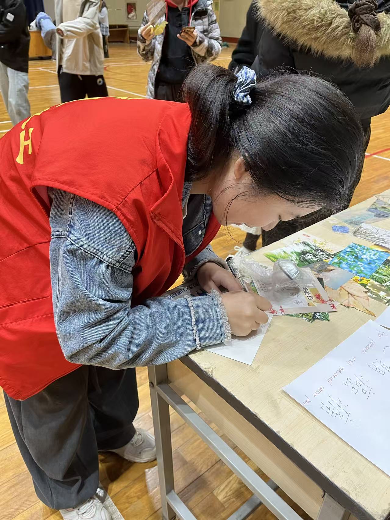 当同学们伏案仔细为患者们写明信片时,我不禁感叹生命,一定是有温度的。有位女生写了整整十分钟,写完腼腆地把明信片拿给我看,问:“这样写,可以吗?”眼神那么认真,她的每个字都承载着独特的重量。还有位男生拿着明信片在摊位旁徘徊着思考了很久,最后在明信片上留下:“窗外的梧桐叶快落光了,阳光却正好,暖融融地照进来。我们与您同在。”