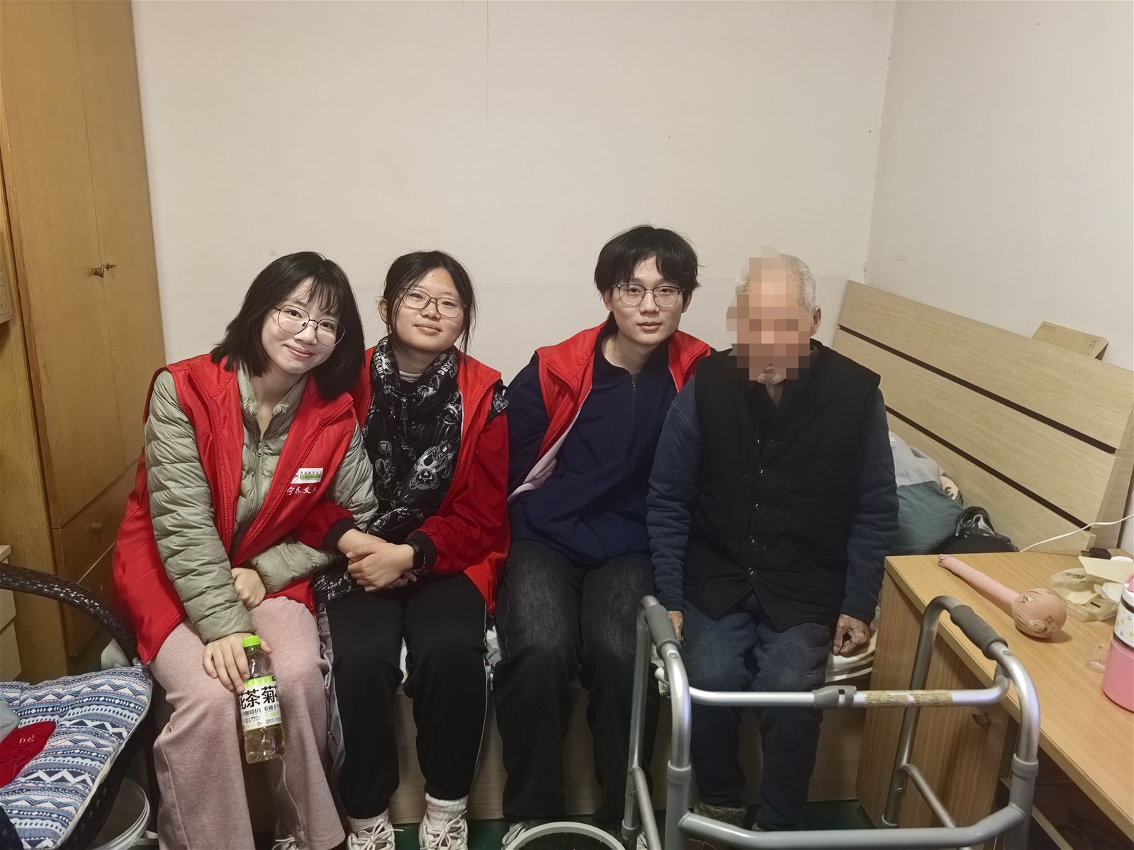 我们围坐在陈爷爷的床边,陈爷爷总是爱看新闻,这次也不例外,可能这是陈爷爷卧床唯一的娱乐方式吧。每次想到陈爷爷这般孤单,内心总是抑制不住的想要常来看看,常常陪伴。没过一会陈爷爷扶着助行器站起身来,便开启的陈爷爷的“锻炼”——陈爷爷扶着助行器在屋子里很慢很慢地挪动。走上几米,便是在小小屋子里的一个来回。陈爷爷边走边和我们讨论新闻中的大事。看到国家发展繁荣时,陈爷爷脸上无不透露着对祖国的自豪,看到国外战乱不堪时,陈爷爷又在庆幸生活在这么一个安全的国家。三个来回,陈爷爷便觉得有些疲惫,又重新坐回床边。三个来回,仅仅十来米的距离,对我们来说甚至只是动动腿的程度,我突然意识到了陈爷爷不仅深受着癌痛的折磨,还有年老对身体的负担,他不仅是一位癌痛患者,还是一位88岁的老人,承受着糖尿病的老人,承受着行动不便,腰椎疼痛的老人。