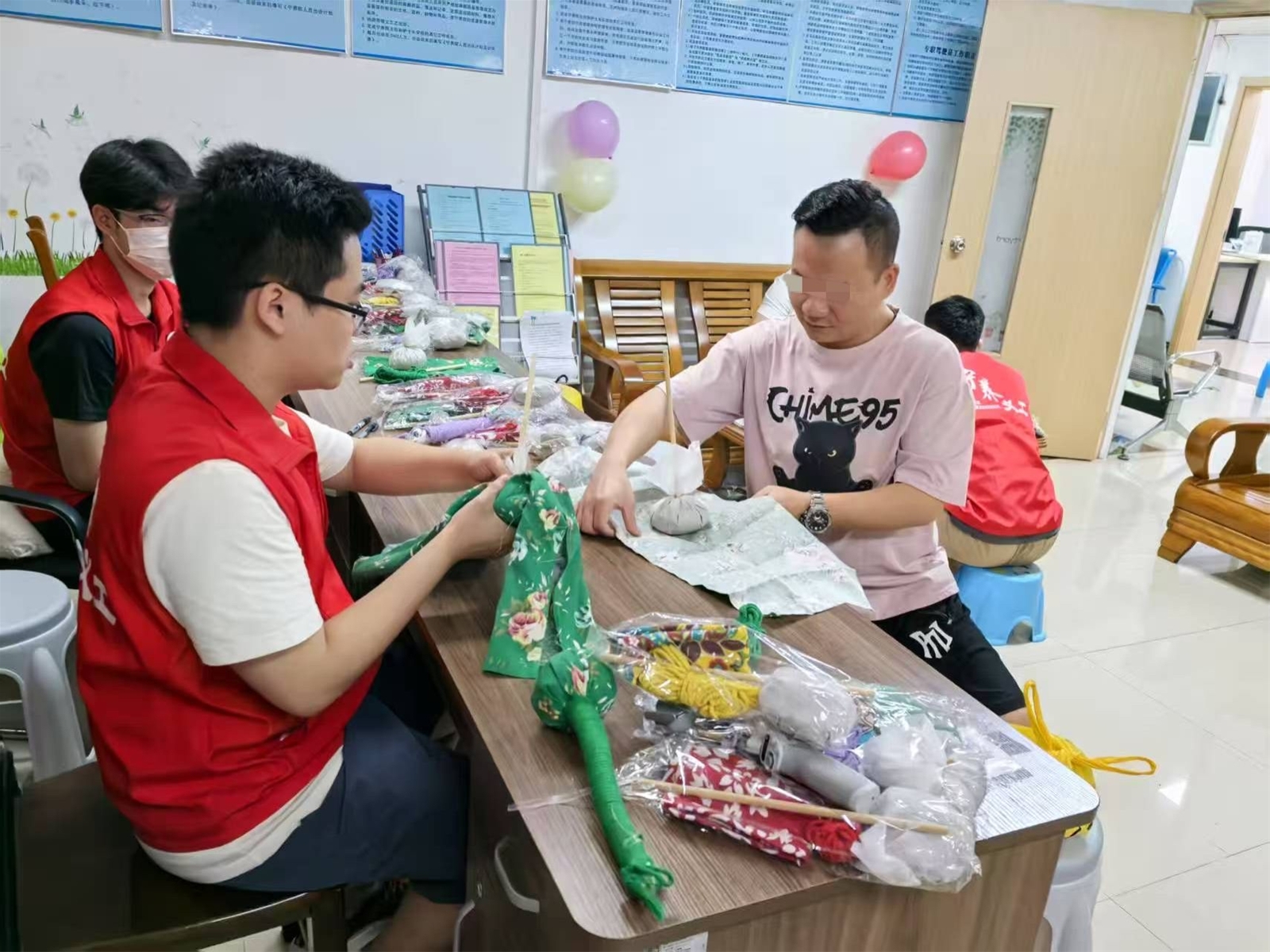 笔者 (近镜头,穿义工红马甲) 在门诊服务中指导家属制作艾草锤
