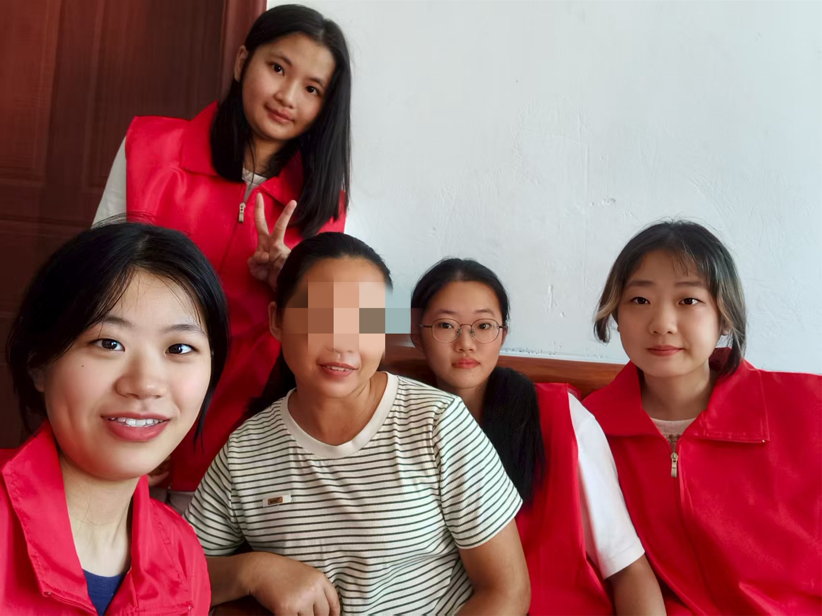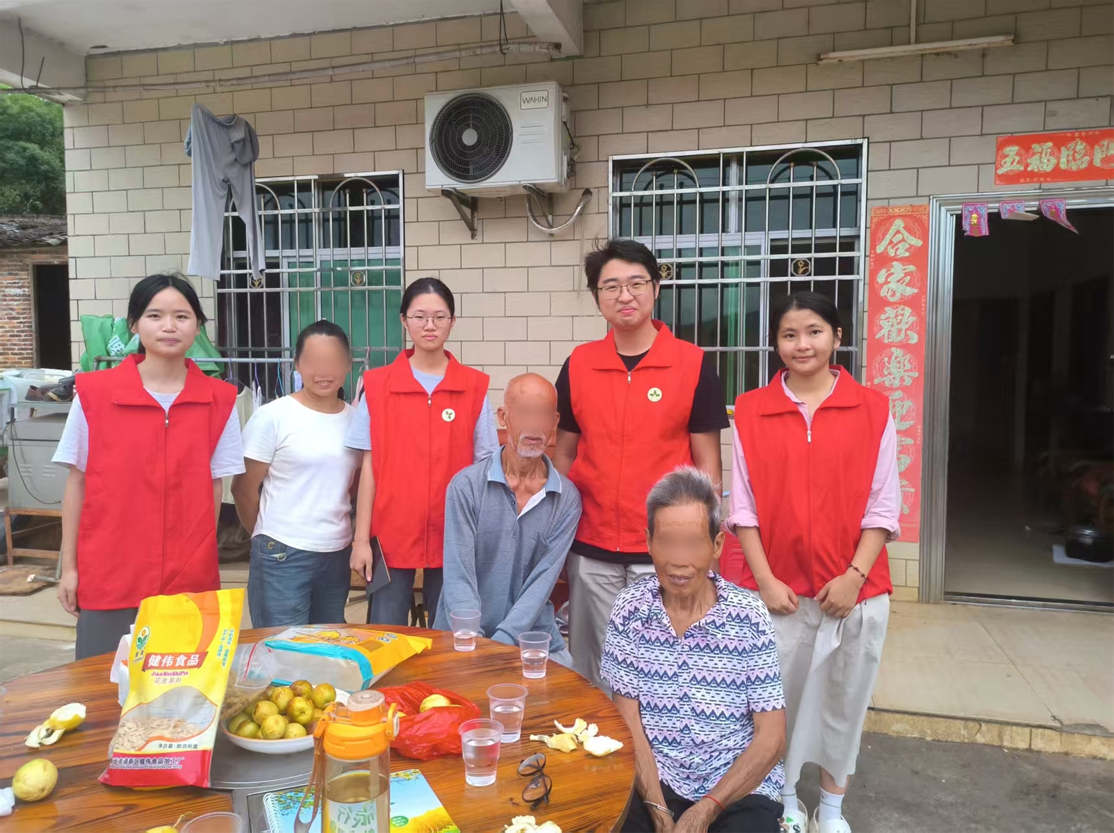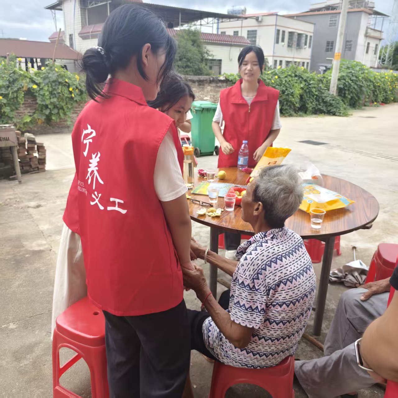刚下车,黄婆婆热情的儿媳便笑眯眯地迎了上来。路过她家旧院子围墙时,她敏捷地爬上去,摘下两个新鲜的火龙果,自然地分成两半递给我们。这个突如其来的举动让我忍俊不禁——原来义工服务也可以从分享一个现摘的火龙果开始!走进家门,一只活泼的小鸡吸引了我的注意,没戴眼镜的我竟错把它认作小猫,引得大家一阵欢笑。爷爷拄着拐杖为我们搬来椅子,这一刻,温馨的氛围在小小的客厅里弥漫开来。