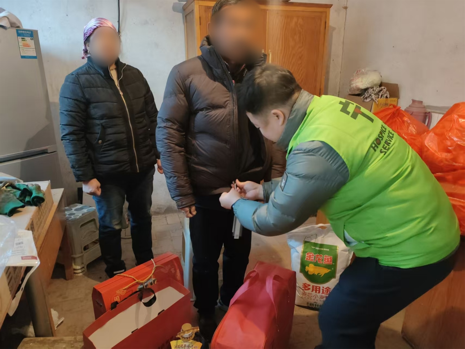 农历腊月二十三(北方小年)宁养院人员入户探访患者,带去过年物资。