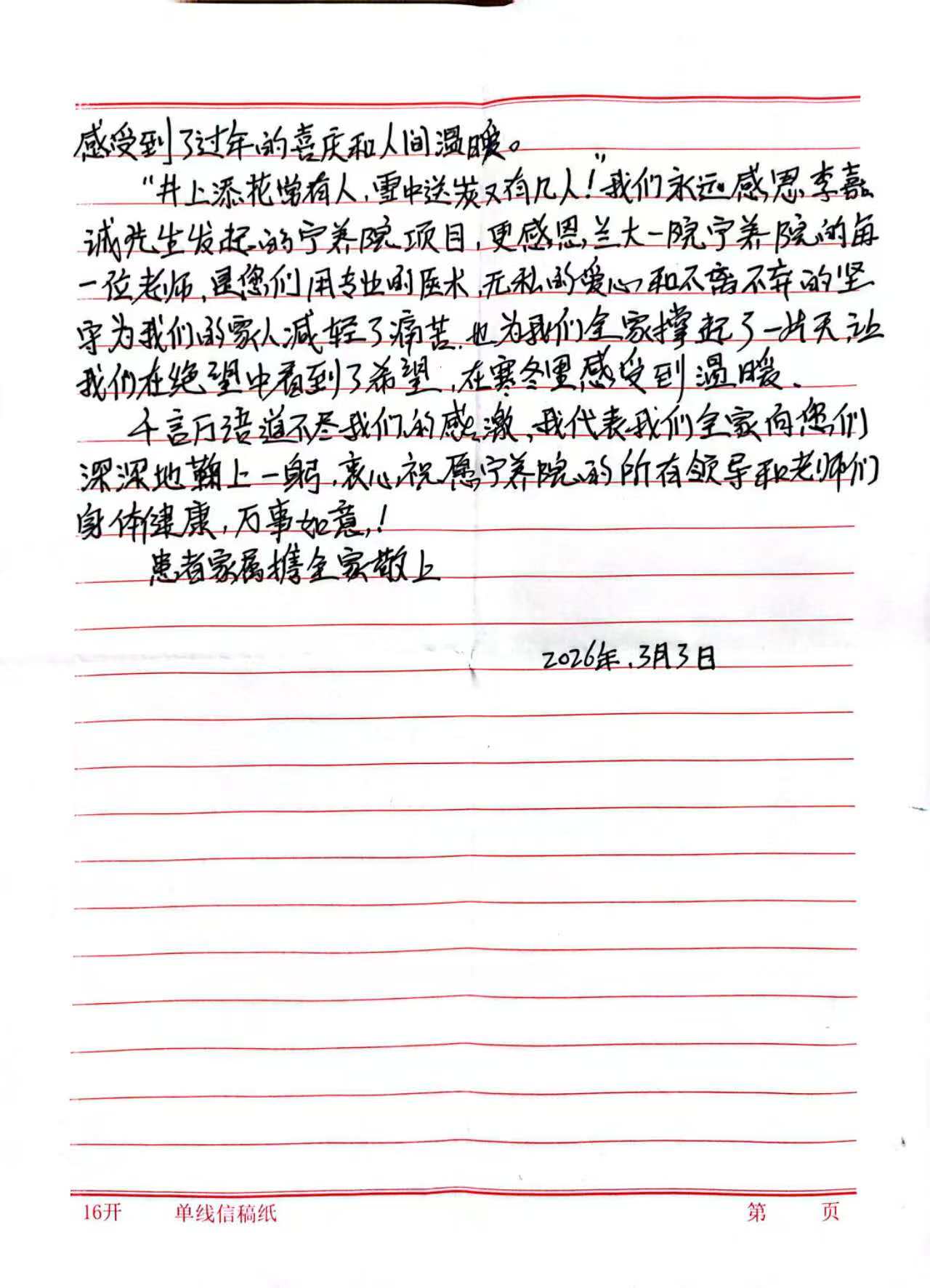 2026年3月10日,患者妻子带来一封感谢信,表达对了对李嘉诚先生及兰州宁养院工作人员的感谢!感谢信内容如下: