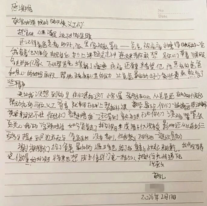 “爸爸被病痛折磨时,是宁养院的白衣天使帮他缓解了疼痛;我成绩滑坡、对未来迷茫时,是医学生义工哥哥姐姐们拉了我一把。”新春伊始,一封来自初三学生小宇(化名)的感谢信,悄然送至新疆医科大学附属肿瘤医院宁养院,字里行间流露出的真挚情感,让医护人员和义工们感动不已。这封信的背后,不仅是一个家庭走出阴霾的故事,更是我院宁养服务践行全人关怀、医学生用行动诠释医学人文精神的温暖缩影。