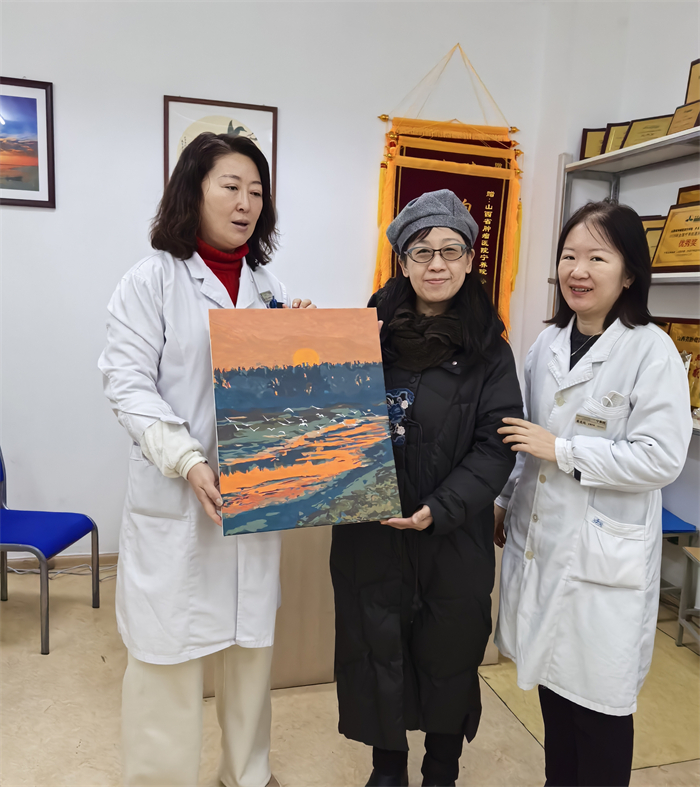 患者家属到宁养院送来其亲手画作《日出》,表达对宁养院的感谢