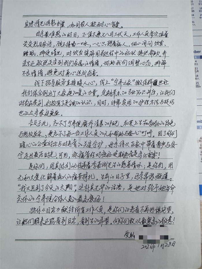 这份感恩,凝聚在凌晨四点伏案写下的感谢信里,也藏在一笔一划勾勒的日出画作中。外孙子曾说,写感谢信太辛苦,不如送一面锦旗,可二女儿始终觉得,亲手画的画、亲笔写的信,才有独属于自己的温度,才有藏不住的真情。在她心中,母亲的坚强背后,是宁养院最坚实的支持——这份支持,不仅是缓解病痛的药物,更是浸润心底的爱与滋养,是让一家人在绝望中看见希望的光。