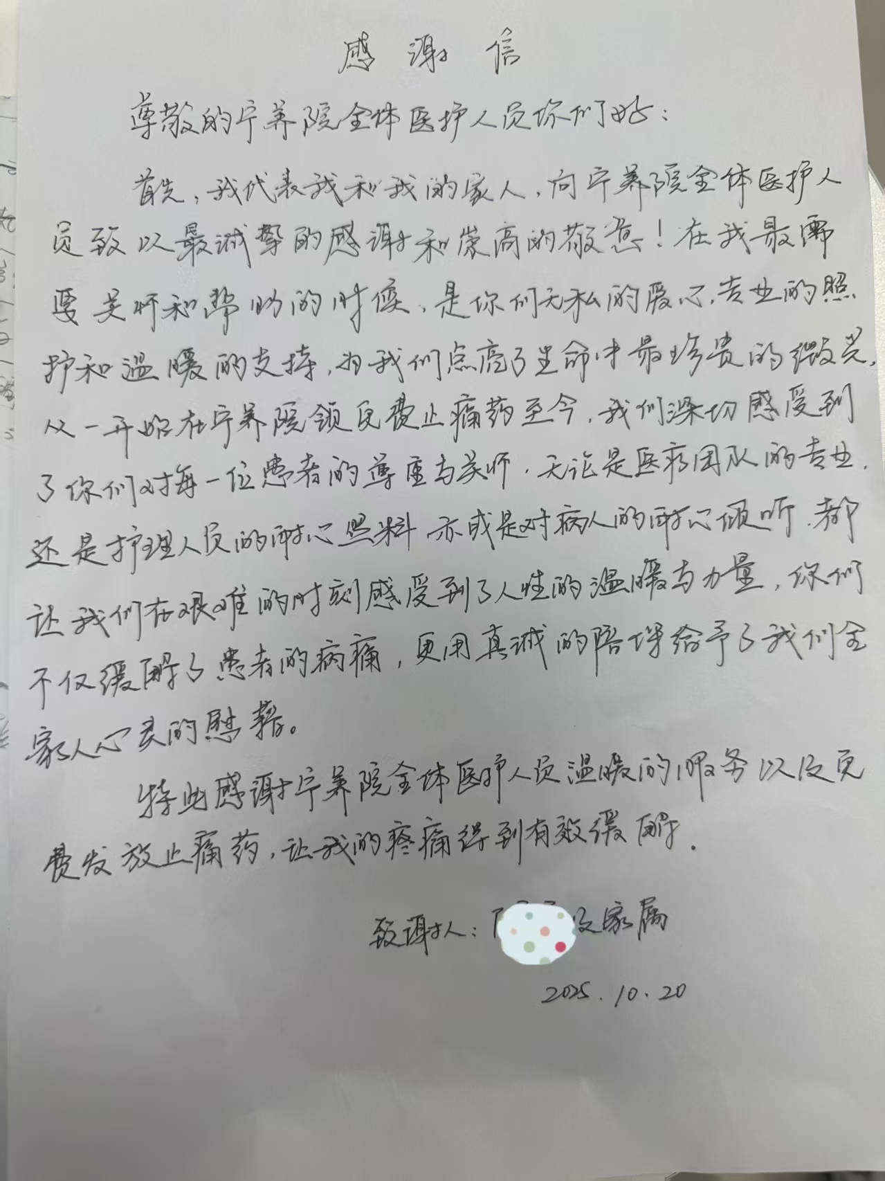 “不仅缓解了患者的病痛,更用真诚的陪伴给予了我们全家人心灵的慰藉。”家属在信中特别提到,宁养院免费发放止痛药的服务,有效减轻了患者的疼痛困扰,而全体医护人员始终如一的温暖态度,更让他们在面对疾病时不再孤单。简单的话语,既是对宁养院服务的高度认可,更是医患之间真挚情感的生动写照。