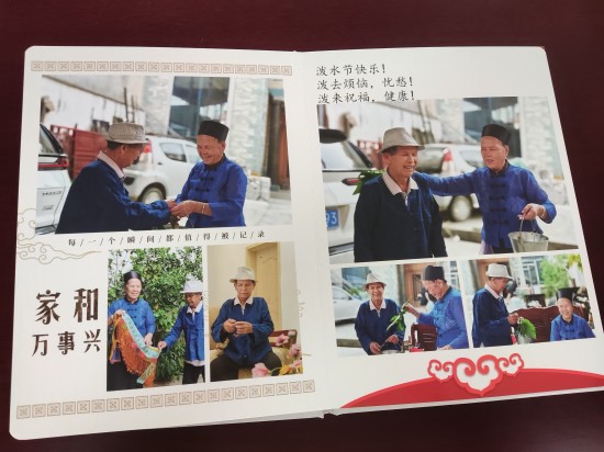 第二个家庭,是地道的芒市本地傣族家庭,因为家里人聚不齐,就只是拍摄老俩口的“夫妻幸福合照”。2023年4月18日拍摄时,正是当地傣族传统节日“泼水节”,是全民狂欢的节日,村村寨寨都很热闹。我们到患者家时,老俩口已经特意换好了傣族传统服饰,还特意穿了同样的宝蓝色系,满面笑容的迎接我们。患者是丈夫,一边用带着傣族口音的方言说着“老夫老妻了,害羞呢啵”,一边却非常配合的跟着我们的指导摆出各种“耍帅、搞怪”的姿势,把我们也逗得开心无比!送相册那天,他的病情恶化严重,整日睡在床上不能动弹,可见到相册,仍然开心得像个孩子。“恰好我动不了了无聊极了,相册放在枕头边我一天看几十遍!”然后,又难以置信的一遍遍问我们:“这个要收多少钱”“我们寨子还有哪几家拥有这样的相册。”我们笑着告诉他这是免费的且整个寨子就他独一份,他的那种自豪感瞬间爬满了满是皱纹和皮包骨的脸颊,一遍遍笑着感谢我们。