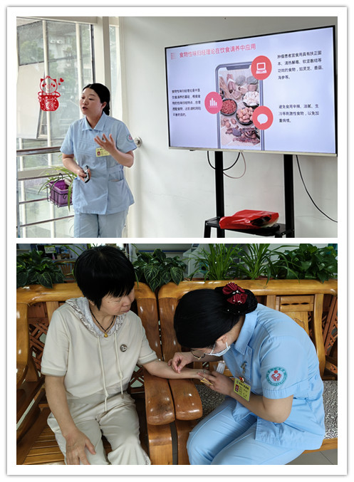 在活动的第一环节,张护士强调了患者应根据时节、体质和临床症状进行食疗。她针对肿瘤科病人进行了膳食调养、穴位按摩方面的指导,教导患者掌握一些自我保健穴位。例如,中脘穴位于腹正中线,脐上四寸,具有理气和胃、化湿降逆、和胃健脾、降逆利水等作用;生姜被誉为呕呃之圣药;小米大枣粥对气血两虚有很好的疗效。这些内容引起了在场人员的关注,大家纷纷用手机记录。随后,张玉清护士向患者推荐了不同症状的中医外治法,并让患者及家属现场体验穴位贴敷、耳穴压豆、腕踝针等治疗方法。患者及家属们意犹未尽,纷纷围着张玉清护士询问有关肿瘤中医保健的知识。
