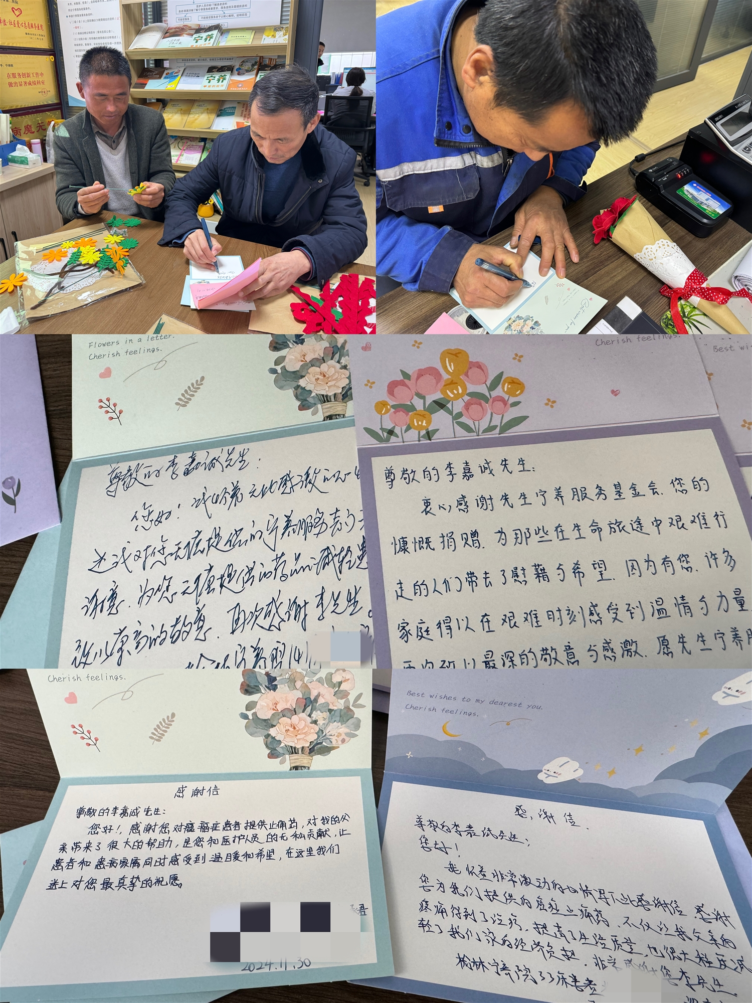 与此同时,社工也准备好卡片和笔,收集患者及家属们对李嘉诚先生以及自己亲人的感恩之言,鼓励他们用最淳朴的语言将心中的感谢表达书写出来。家属们认真思索,把宁养服务比作一束光,照亮了患者和家属前行的路,对李嘉诚先生及医护人员表达了深深地谢意。部分家属也借此机会表达了对自己的亲人的感恩之情。