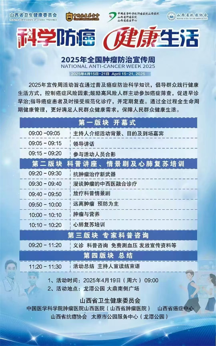 为积极响应国家对于肿瘤防治工作的号召,普及癌症防治科学知识,倡导群众践行健康生活方式,控制癌症风险因素,鼓励高风险人群主动参加癌症筛查,促进早诊早治,2025年4月19日,山西省卫生健康委员会指导,中国医学科学院肿瘤医院山西医院(山西省肿瘤医院)、山西省癌症中心、山西省抗癌协会联合太原市公园服务中心,在龙潭公园大鼎南侧广场隆重举办了第 31 届全国肿瘤防治宣传周活动——“科学防癌 健康生活”。此次科普宣传活动山西省肿瘤医院宁养院积极参与,旨让借助本次大型科普宣传之势,让更多市民参与了解宁养医疗服务,受惠更多癌症疼痛患者及家庭。活动现场气氛热烈而有序。